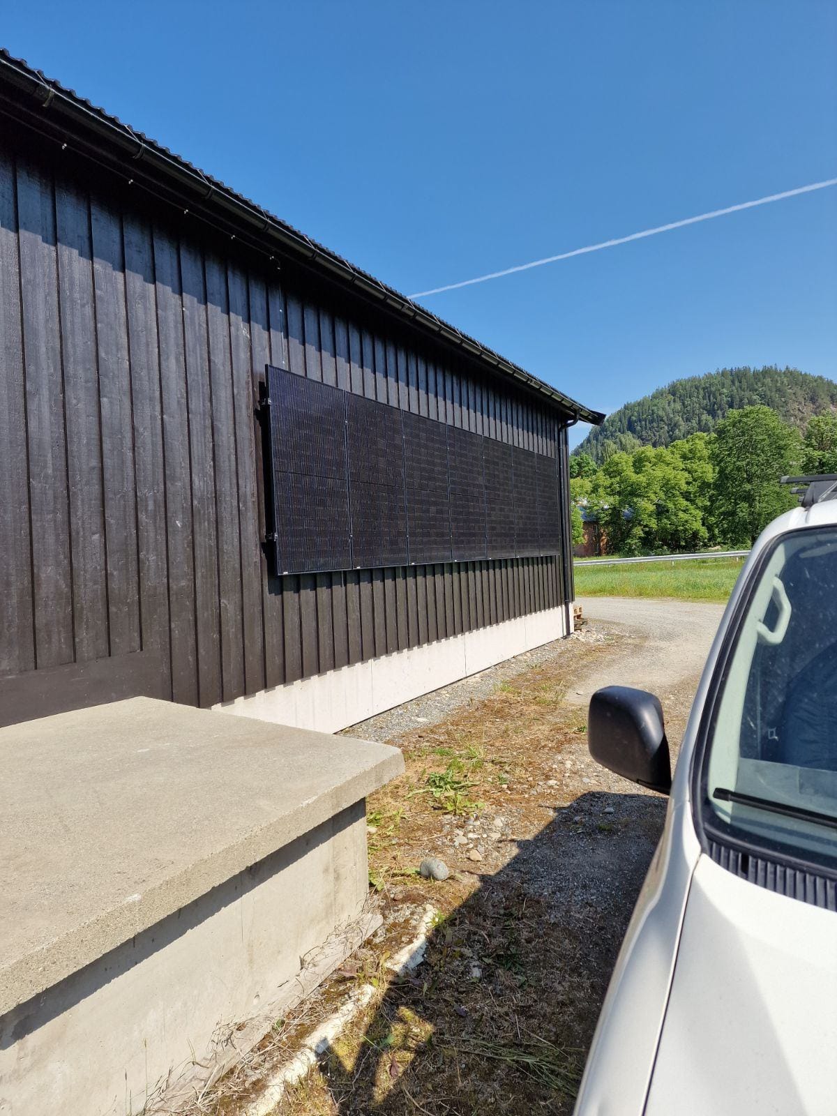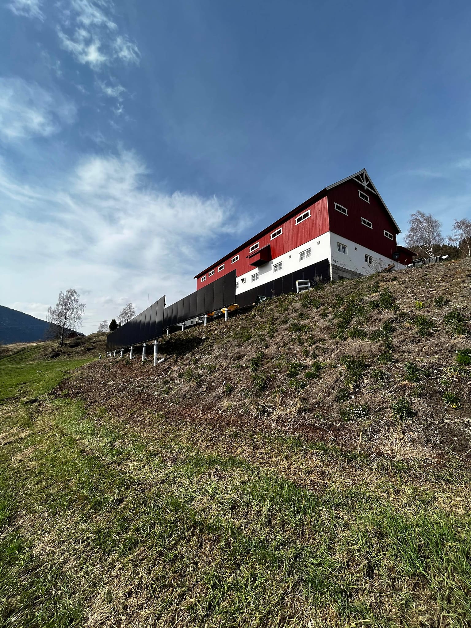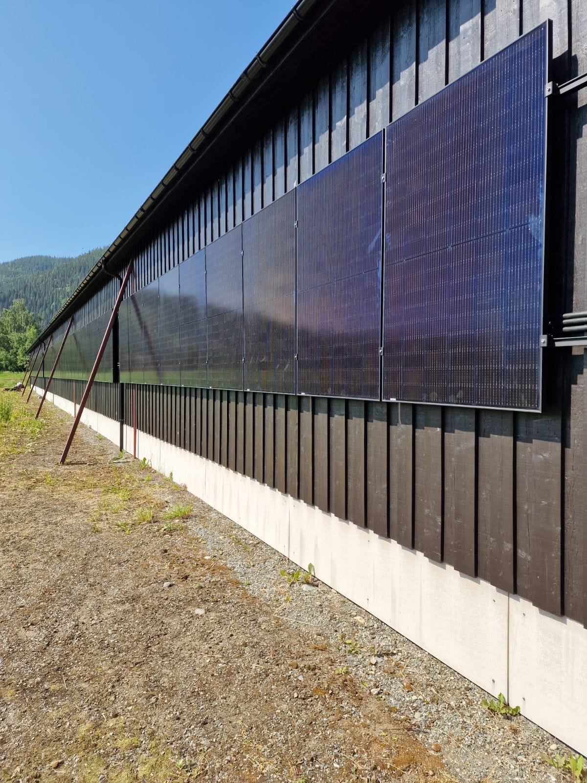Bakkeanlegg montert i 90°. Det gir lavere kostnader på materiell og montering. Hittils har vi ikke sett noen forskjell i effektytelse mot for eksempel panel i 45°. Kunden monterte mye selv og senket dermed kostnadene ytterligere.