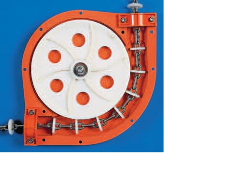 Transportrøret er i galvanisert stål, mens kjedet er av spesialherdet stål. Medbringerskivene er laget i kunststoff.