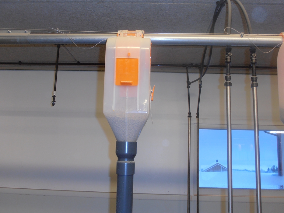 Til fylling av alle typer fôrautomater, benytter vi utløp med skyvespjeld. Dette kan leveres med teleskopisk fallrør. Volumdoserer brukes til purker, og er en gjennomsiktig beholder på 6, 10 og 15 liter. Dosereren har stor sideluke for rengjøring.