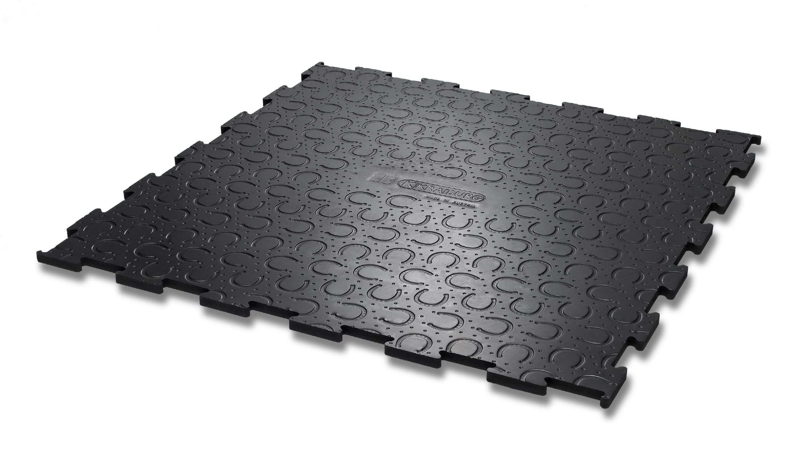 Gummimatte til hest som tåler både sko og brodder. 18mm tykk beregnet i stallbokser. Matten er 1x1m og puzzles sammen til ønsket størrelse. Kan deles/tilpasses den enkelt boks.