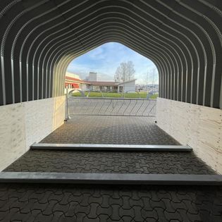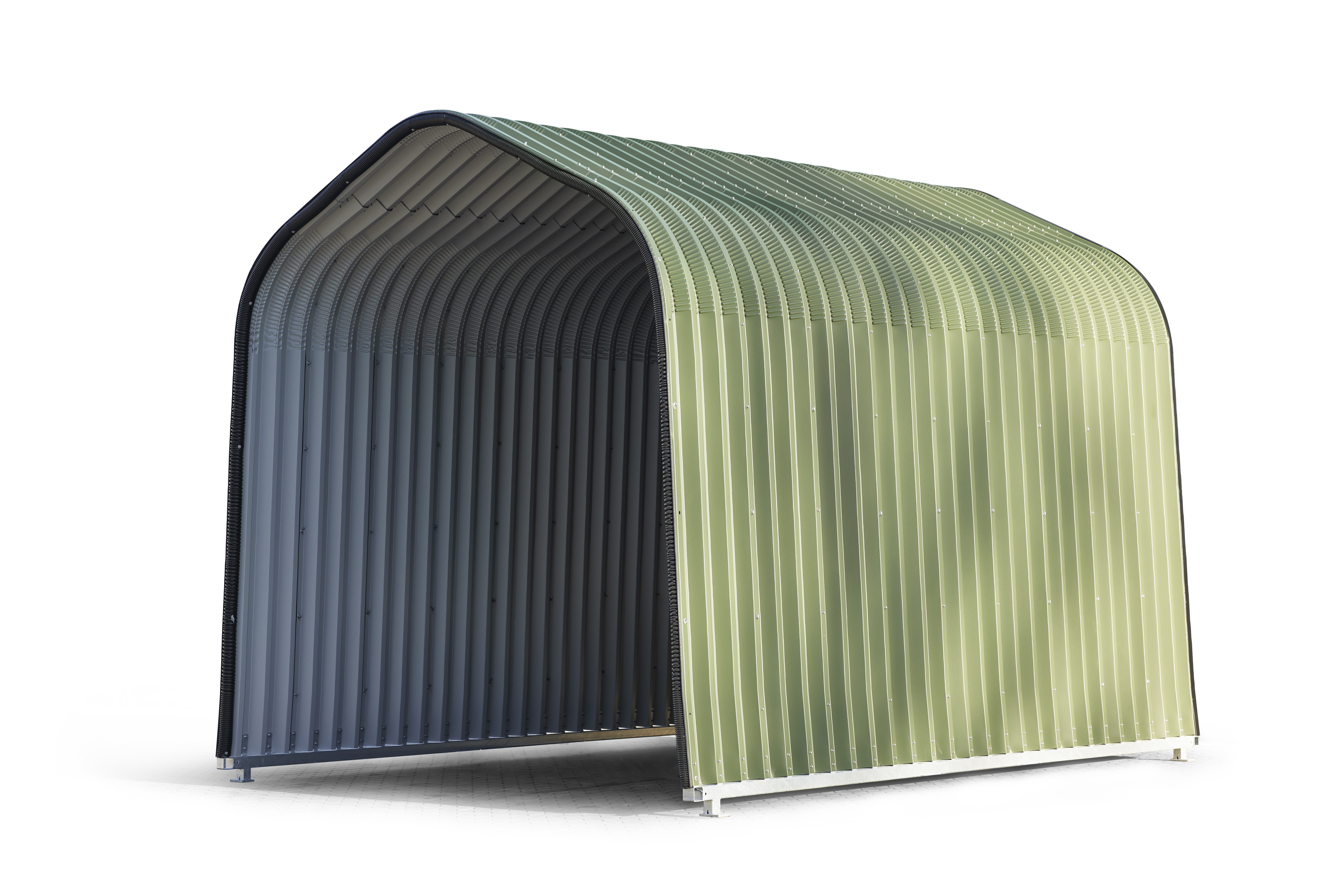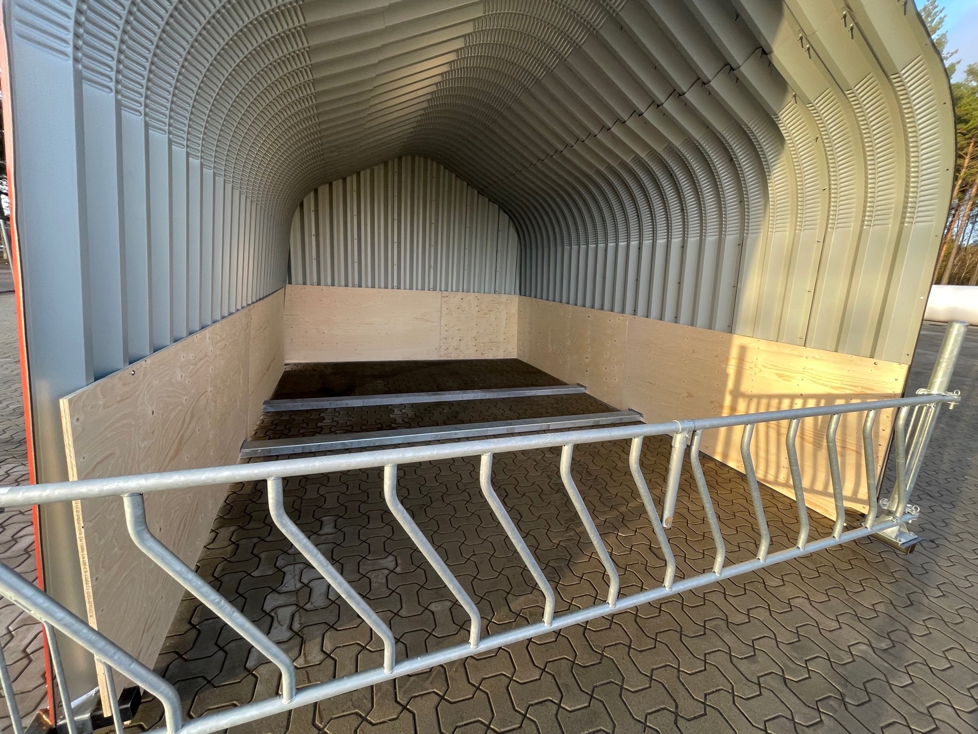 Buehallen leveres komplett med kraftige varmgalvaniserte bunnseksjoner, ferdig bøyde og tilpassede stålplater. Gavlvegg i ene enden. Leveres umontert med komplett boltsett.