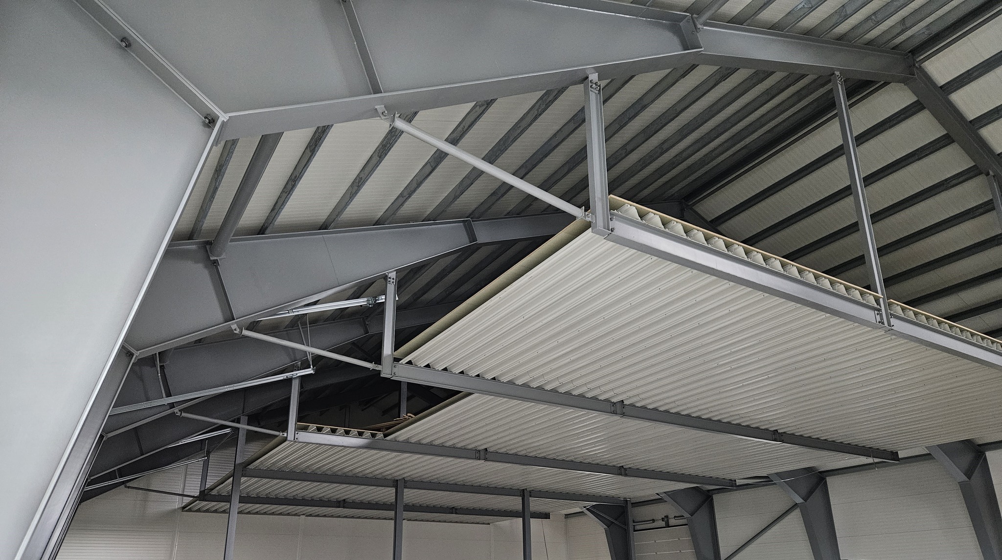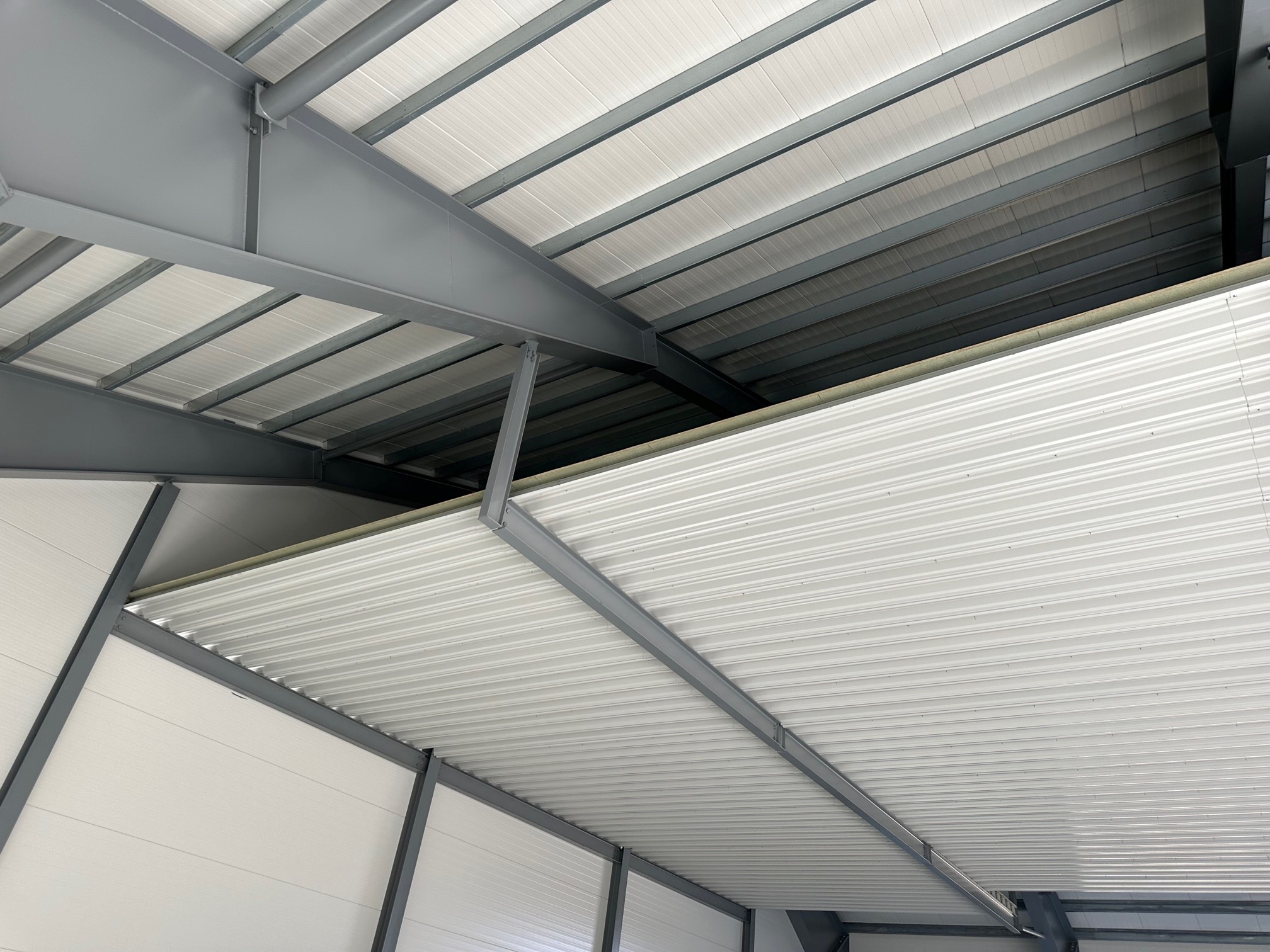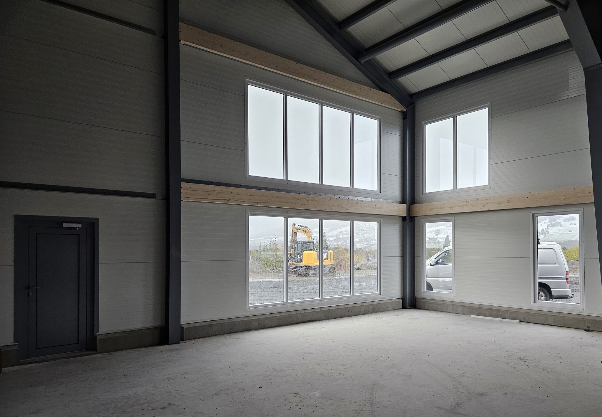 Innvendig er bygget delt inn i seksjoner med flere delevegger, det er også laget «nedstroppet» hems på deler av arealet. Et veldig praktisk og anvendelig bygg der arealet er godt utnyttet i flere etasjer.