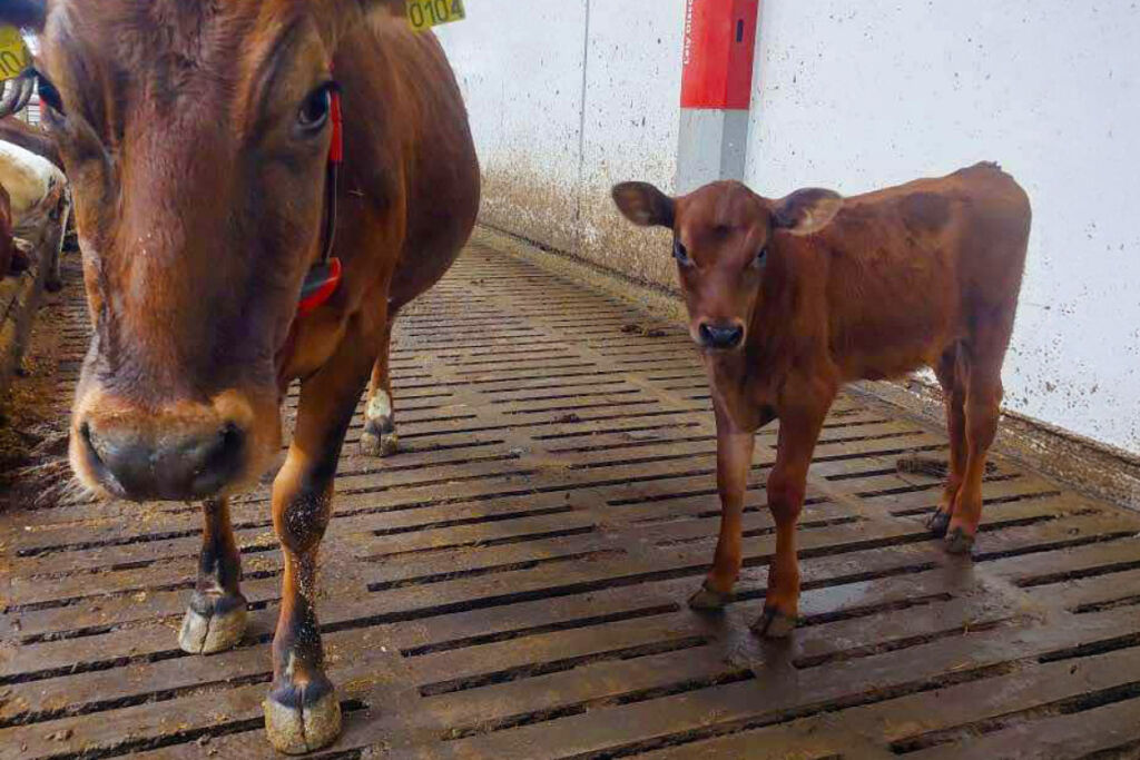 Ku-kalv samvær i melkekufjøset. Foto: Gro og Thore Håland, 2025