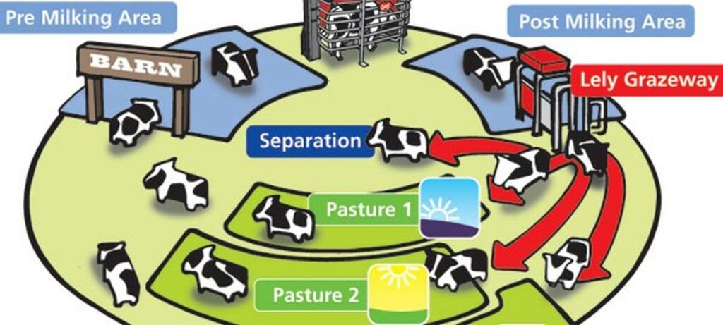 Enkelt sagt er Grazeway en automatisk skilleport og er nøkkelen til å låse opp beiting, da den fungerer som porten mellom robot og beiteområdene. Belønningen gir lavere fôrkostnader og stimulerer melkeproduksjonen.
