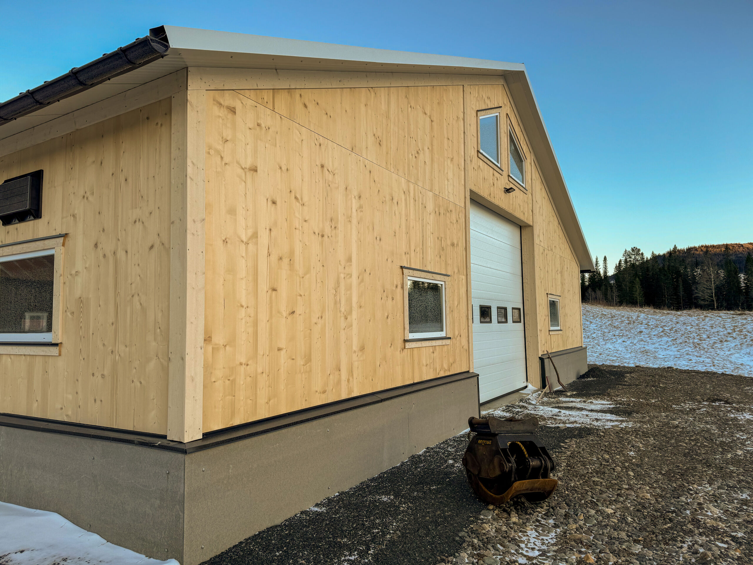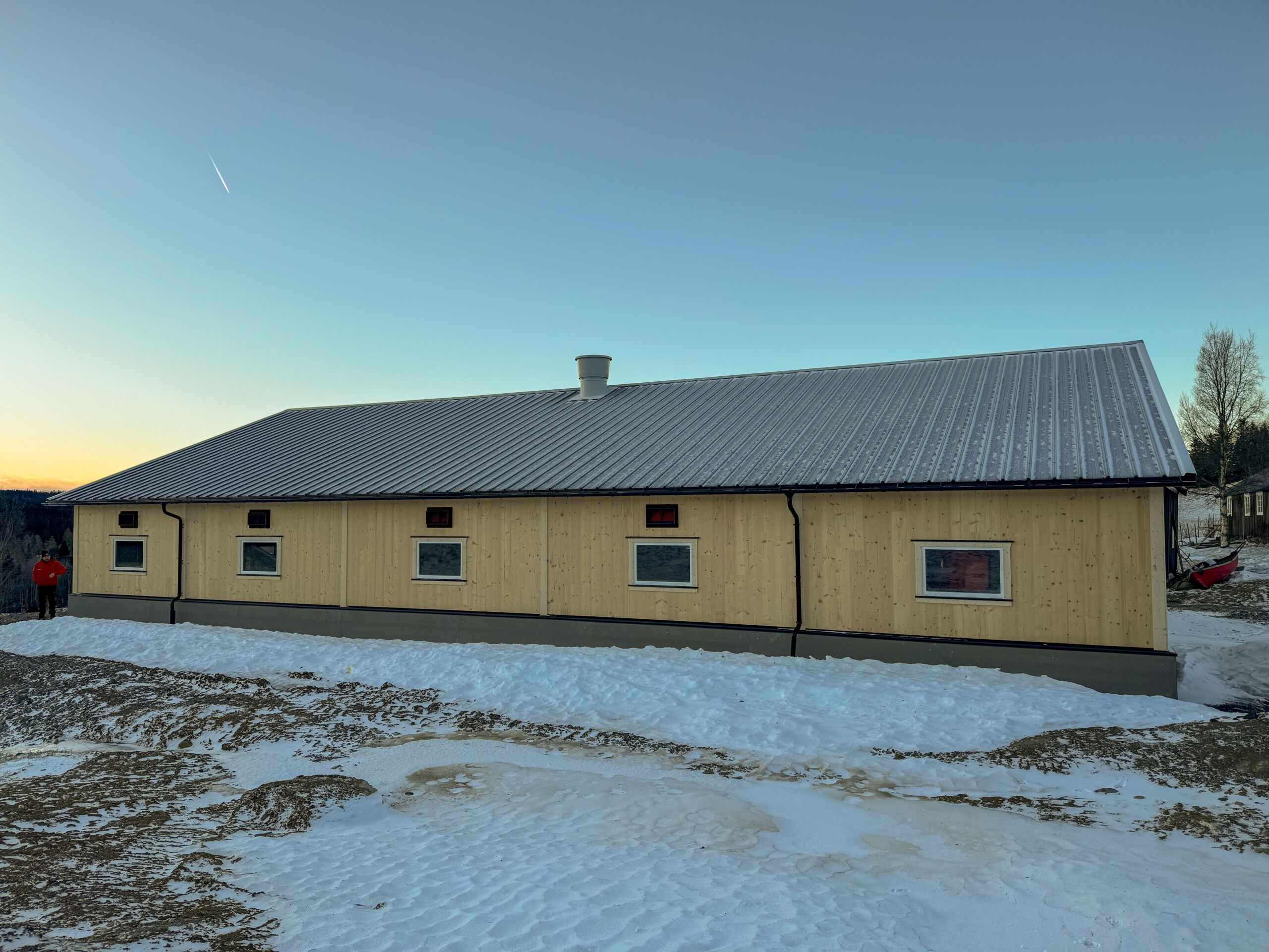 Ogndal: Treveggene er 80 mm tykke, noe som gir god akustikk og godt inneklima. Sandwich-elementene i taket er 100 mm tykke. Grunnmuren har en brystning på 65 centimeter som fanger opp kuldebroen, og det er isolert 5 cm på utsiden.
