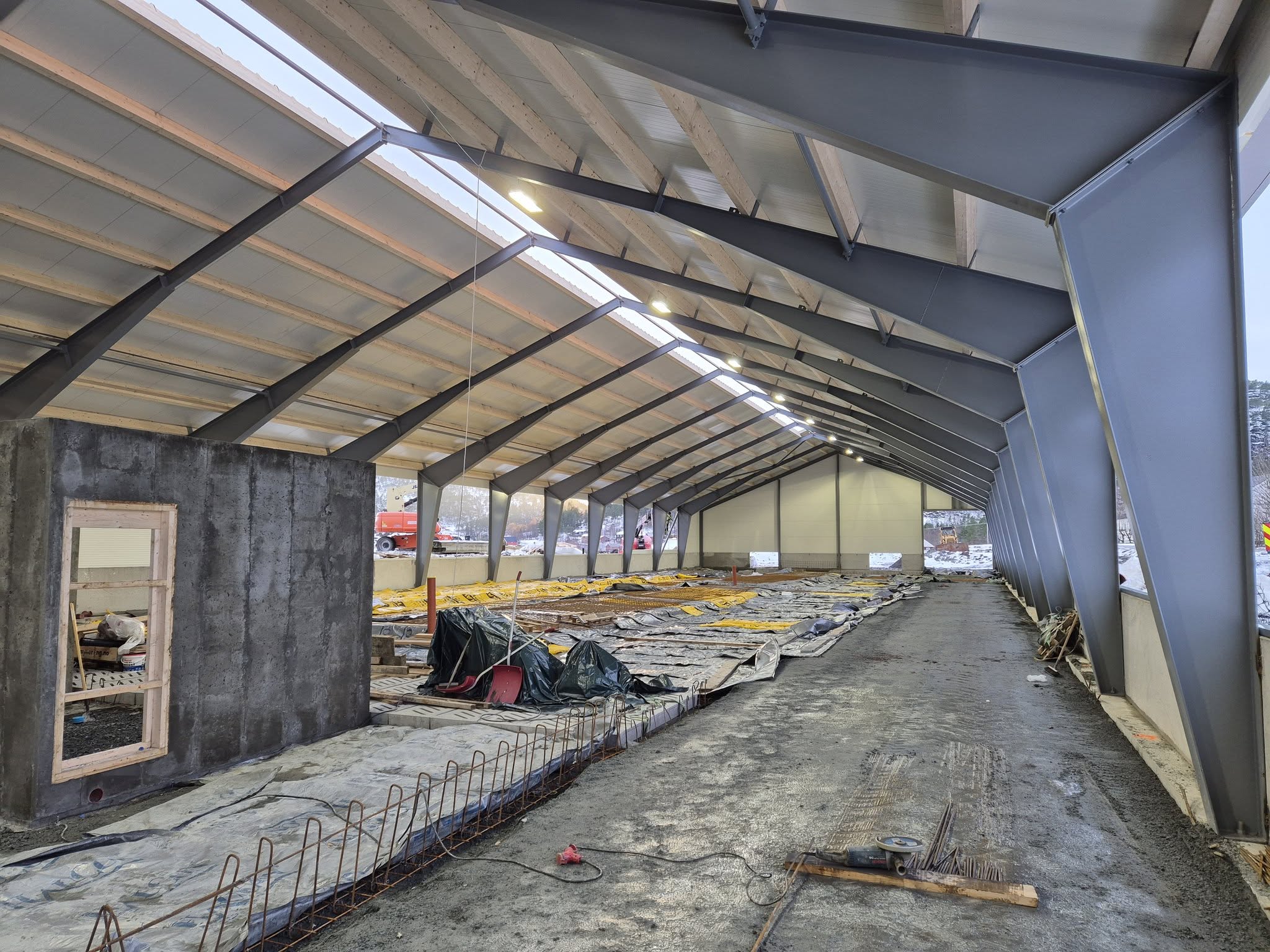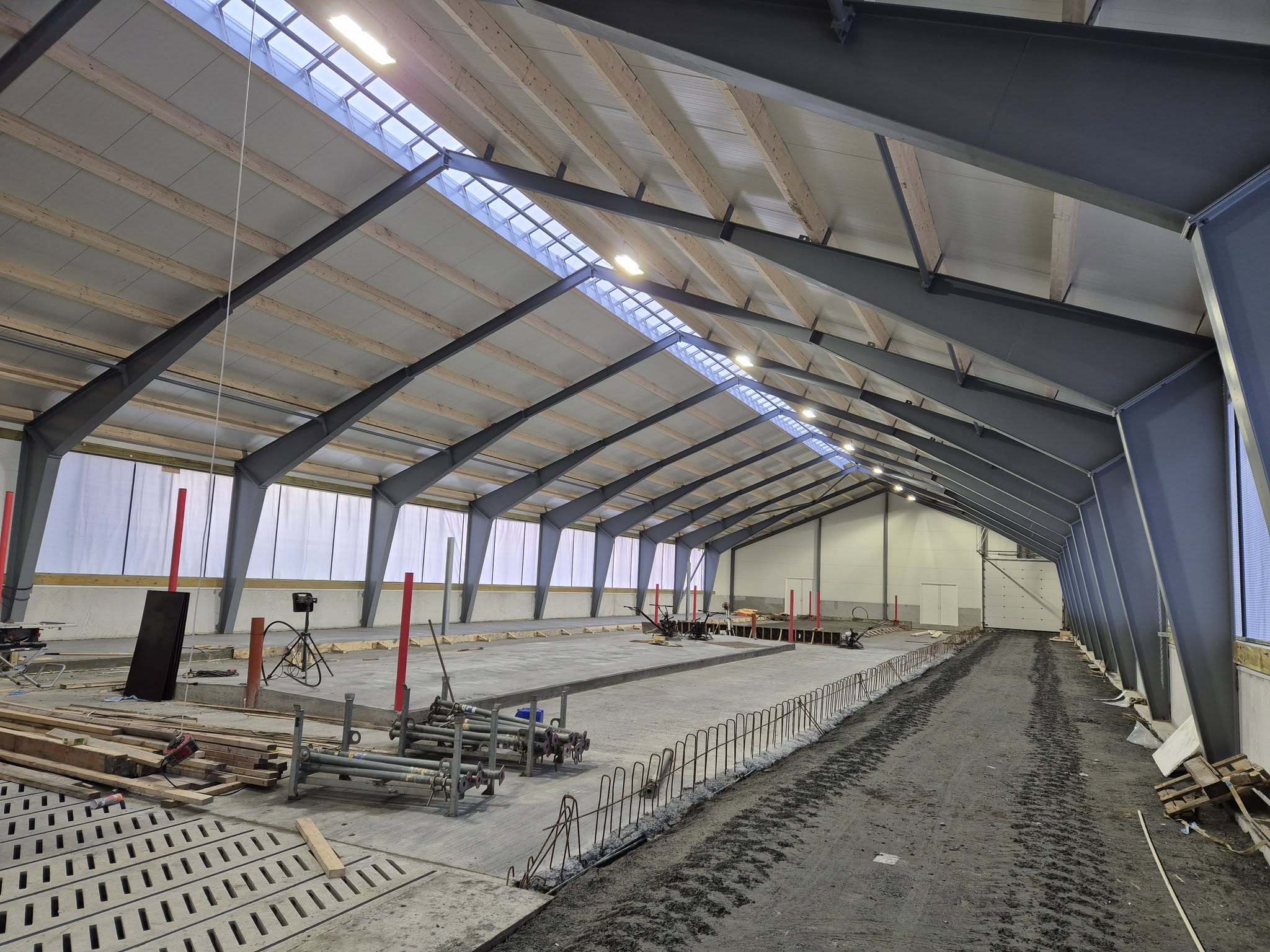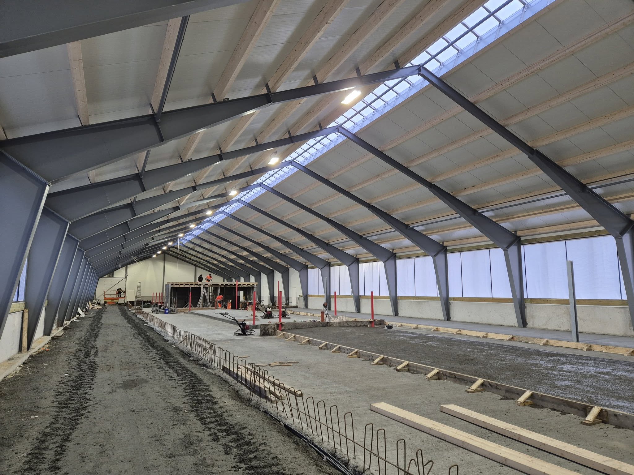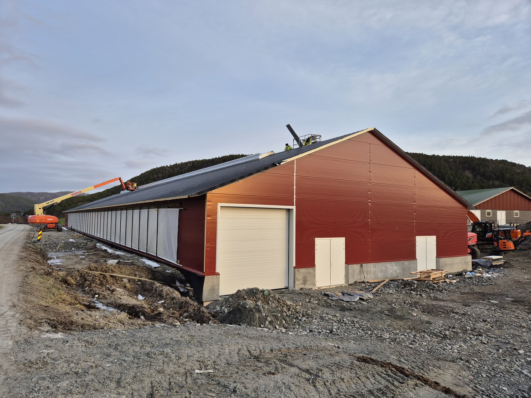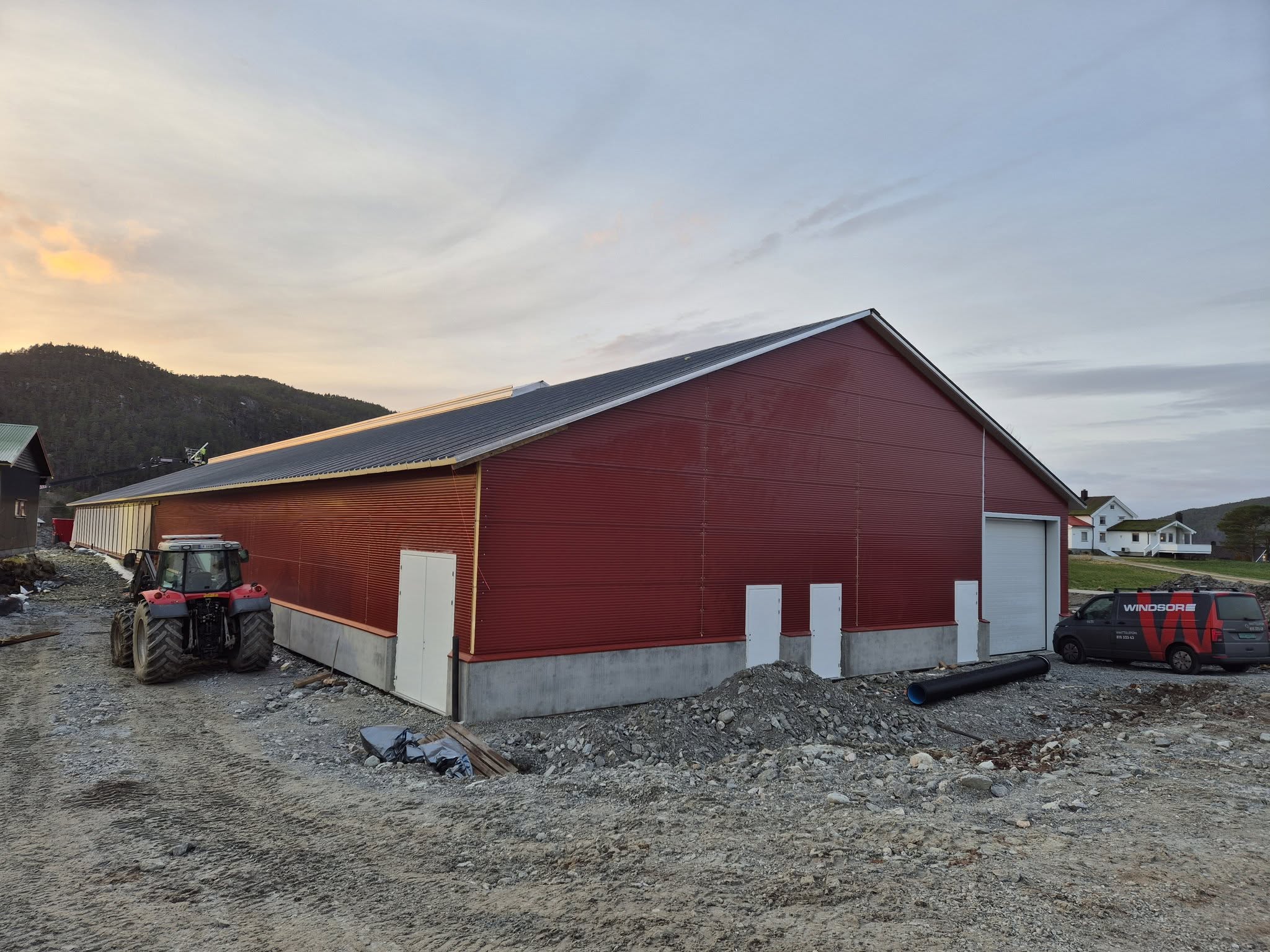 Fjøssystemer Bygg leverer bygg med stålkonstruksjon, limtreåser, 100 mm sandwich-paneler på vegg og tak, dører, vinduer og porter. Vi monterer også luftemøne.