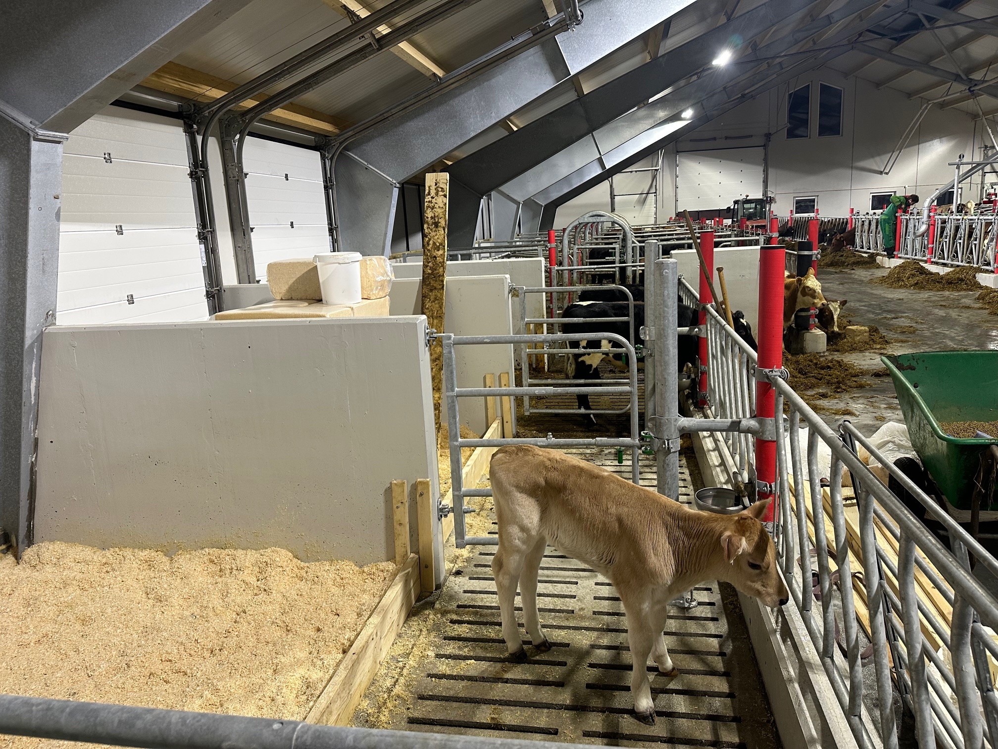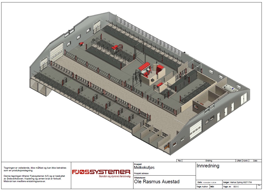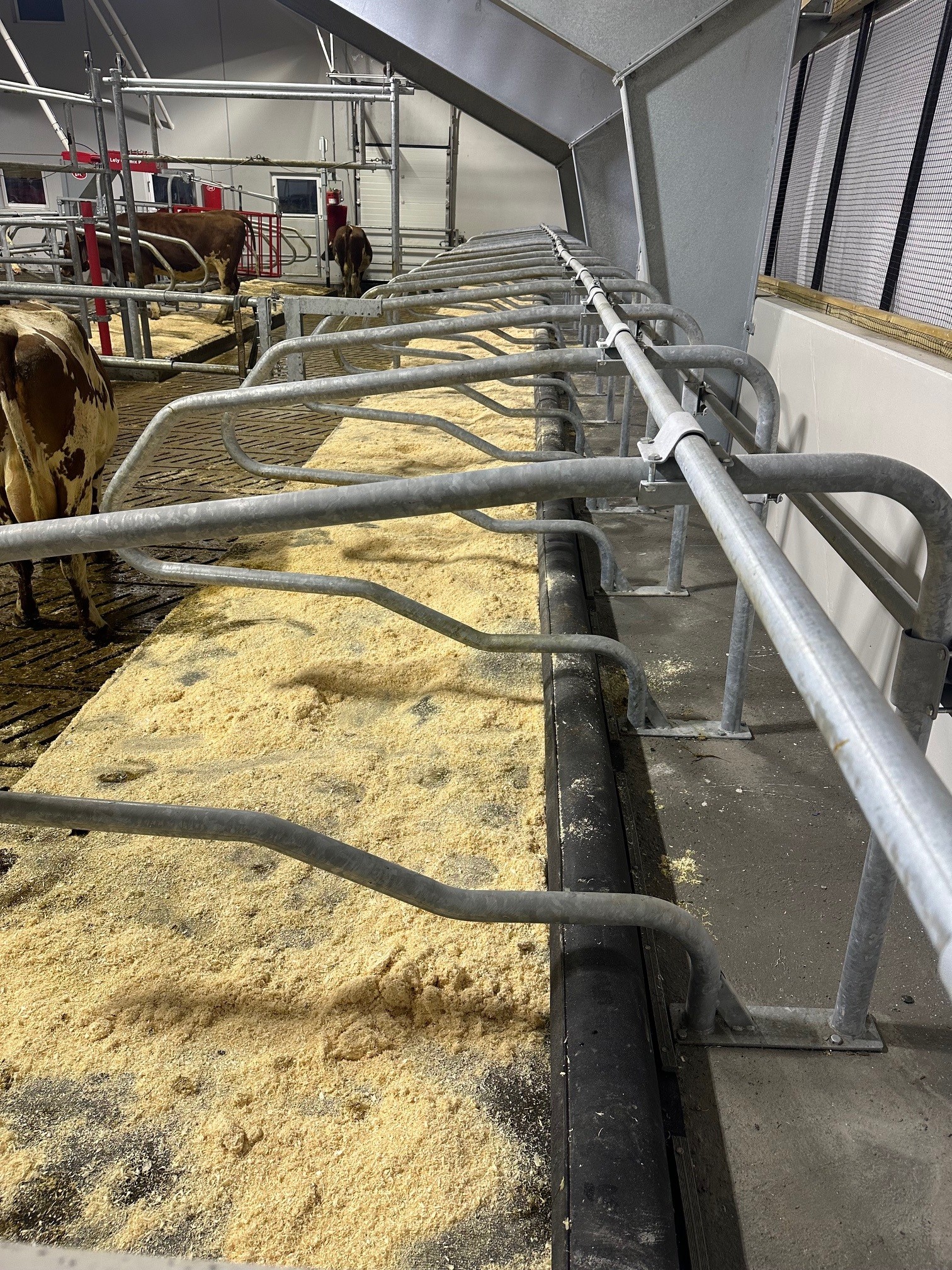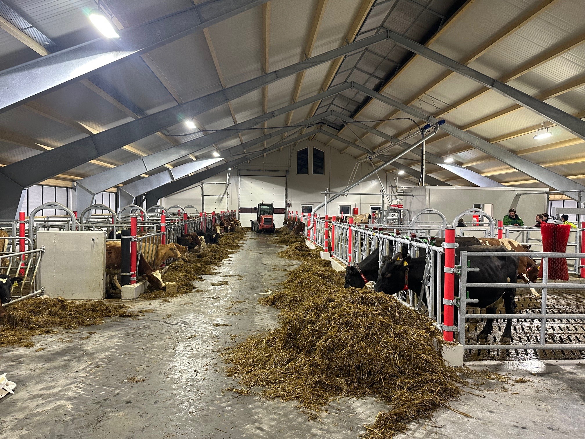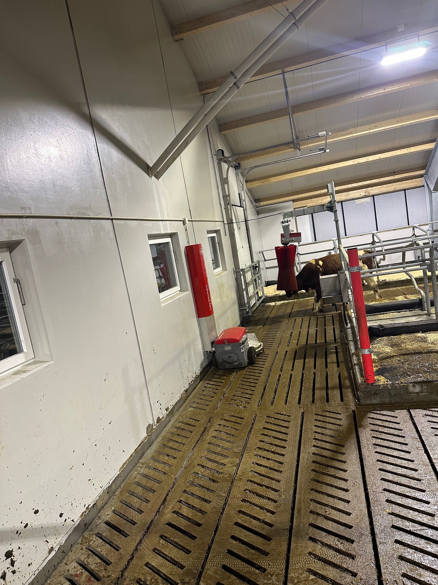 Lely A5 melkerobot med celletallsmåler, aktivitetsmåling og melkeledning 2, Lely Discovery skraprerobot, Lely Cosmix kraftforstasjon, spalter fra Suding, gardiner fra Arntjen, kanalomrører fra Landia, belysning fra Agrilight, innrednign fra Jourdain, vannmadrasser fra Promat og kubørster fra Agricow