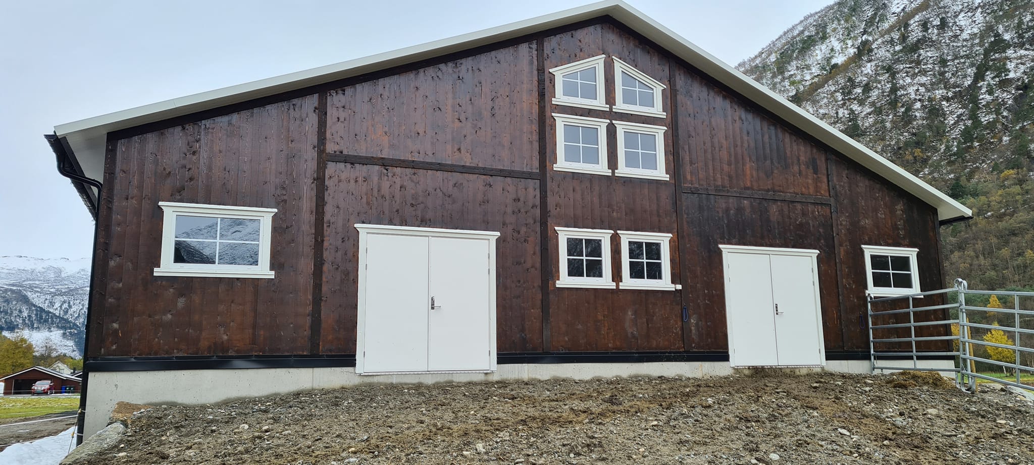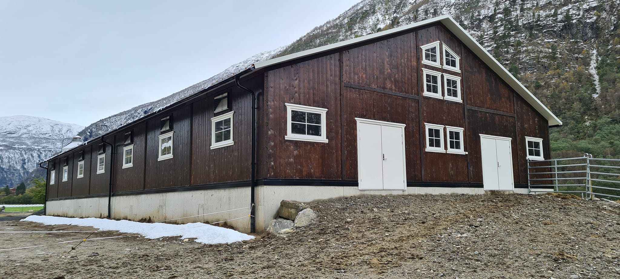 Unni og Tore Gravem i Sunndal kommune bestemte seg for et bygg med stål bæresystem, naturlig ventilasjon, isolert sandwich elementer på tak og vegger av massivtre. Med hvit taksandwich overflate innvendig, samt at Unni og Tore malte både takåsene og veggene hvite, så blir det utrolig lyst og trivelig i fjøset. I tillegg vil overlysplatene i mønekippen slippe inn naturlig dagslys.
