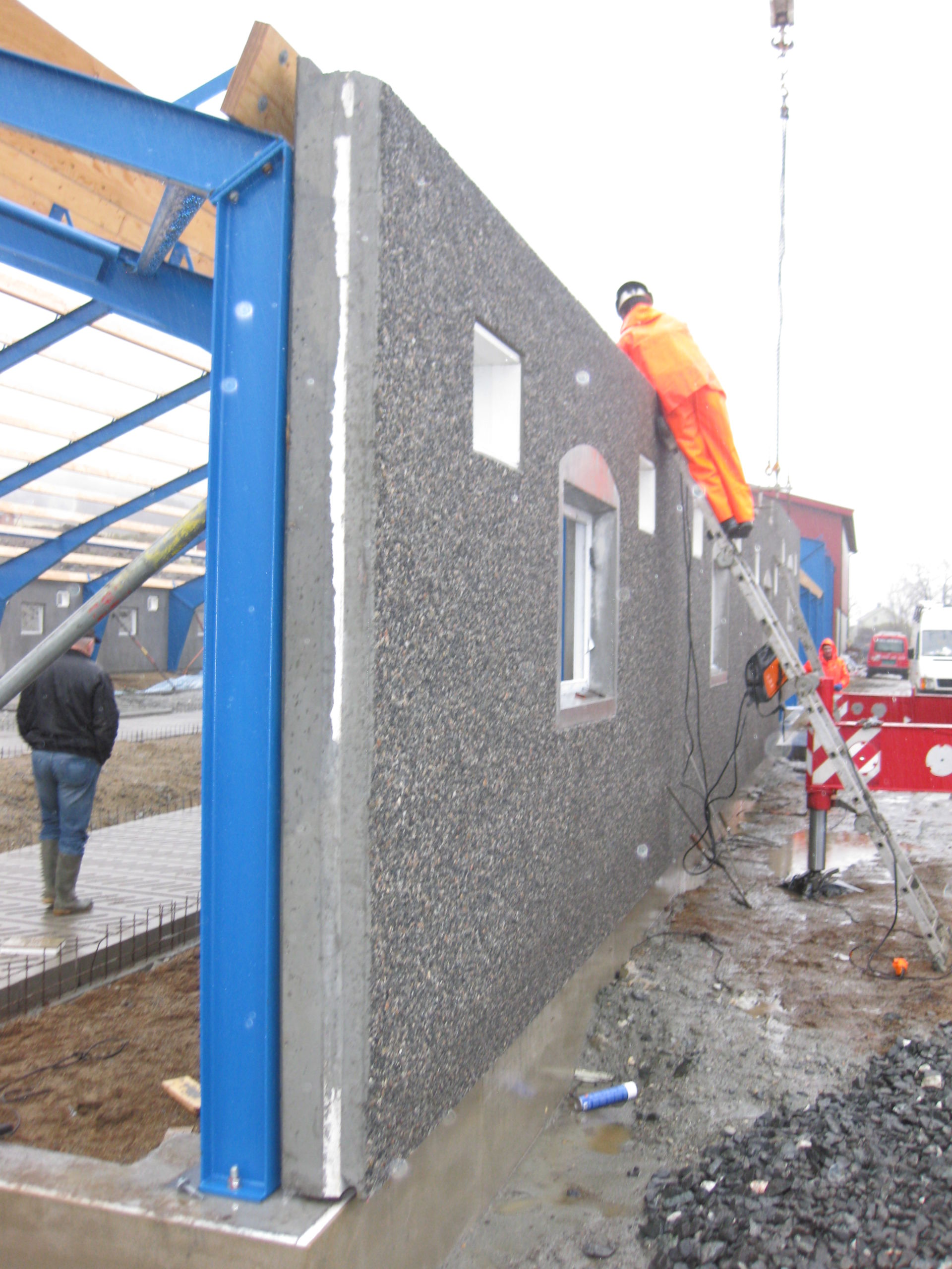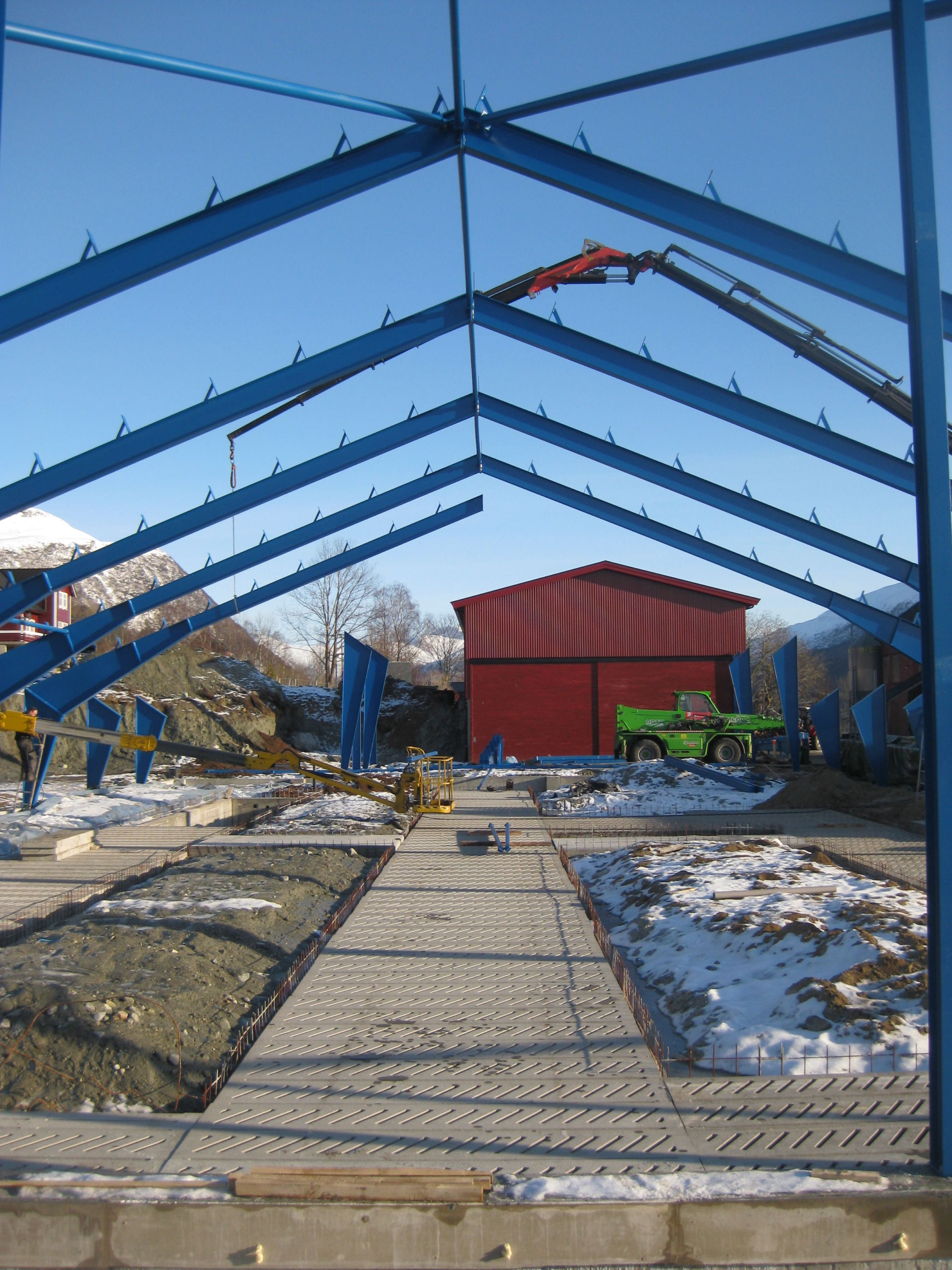 Det er brukt stål som bærende konstruksjon, med betongelementer på vegg, og sandwichpaneler på tak.