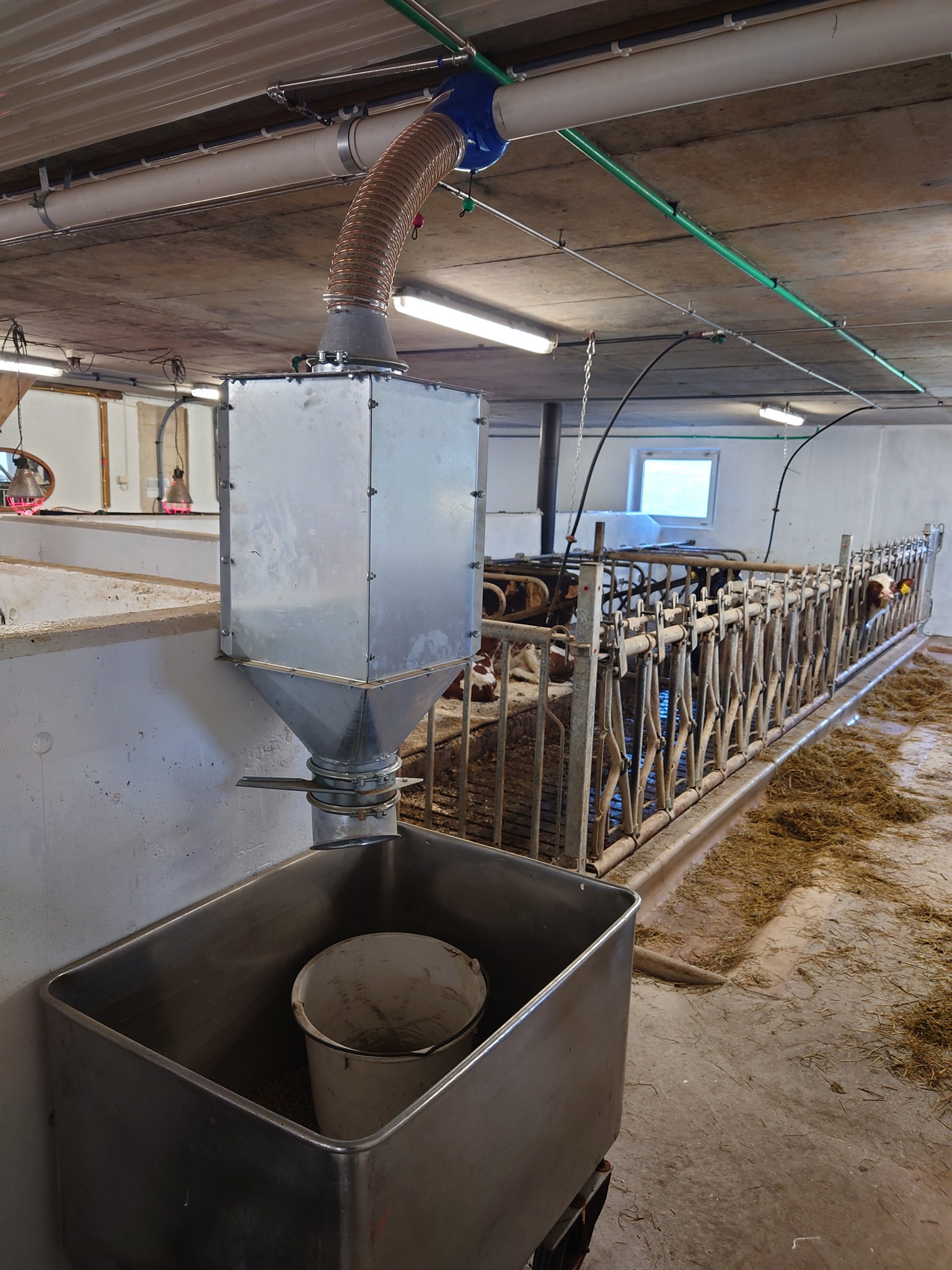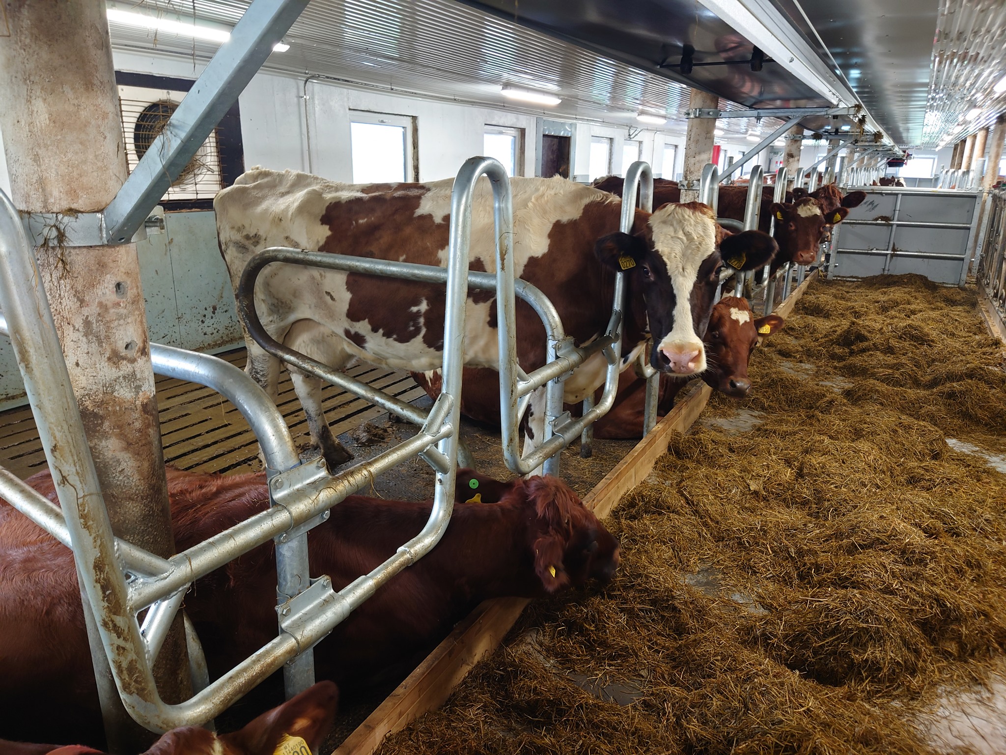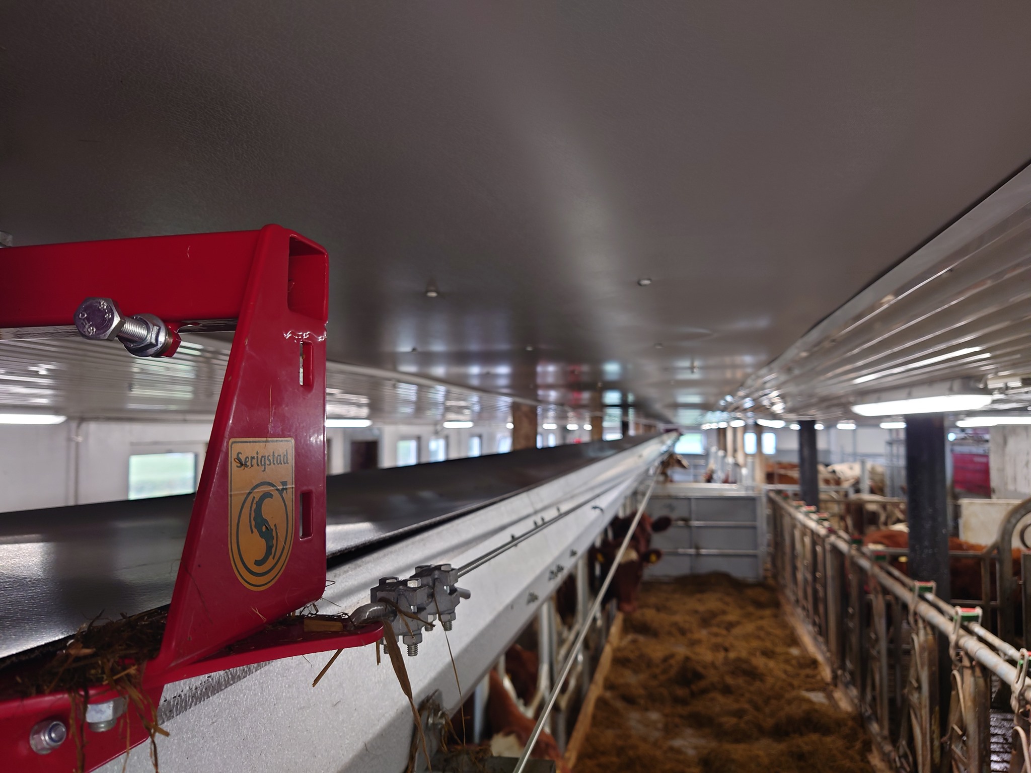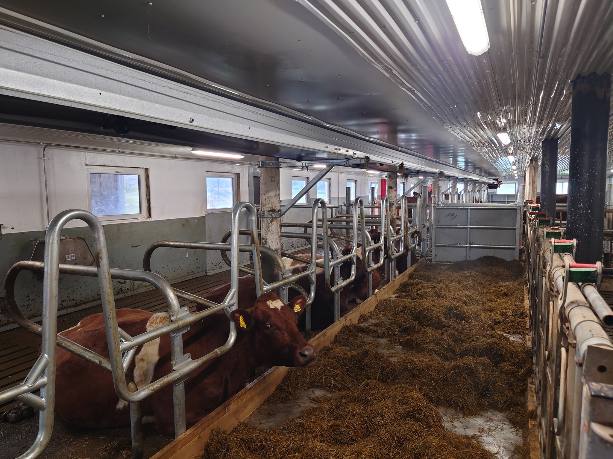 Innredning fra Jourdain og Patura, bandfôring fra Serigstad, gummimatter fra Kraiburg og betongspalter fra Suding. Kraftfôrskure, kukost og drikkekar/støvelspylere sammen med melketank til melkeledning 2 er også levert.