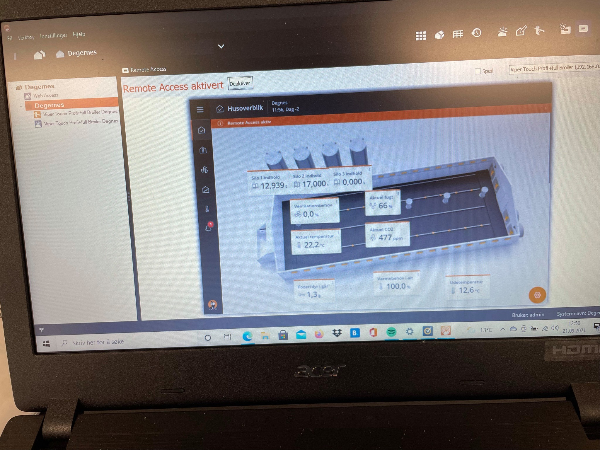Veggmonterte LPC vifter, veggventiler, gavlvifter, alarm, nødopplukk og Viper Touch klima- og produksjonskomputer med BigFarmNet app.