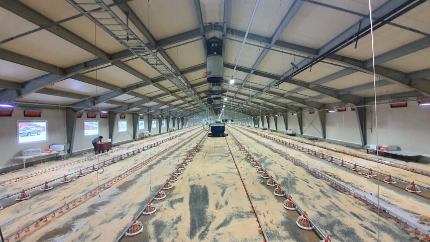- Zeus fullspekter LED-belysning sørger sammen med vinduer for flott og naturlig belysning for kyllingene. Her montert med heisbart opphengssystem som forenkler vask og vedlikehold.
