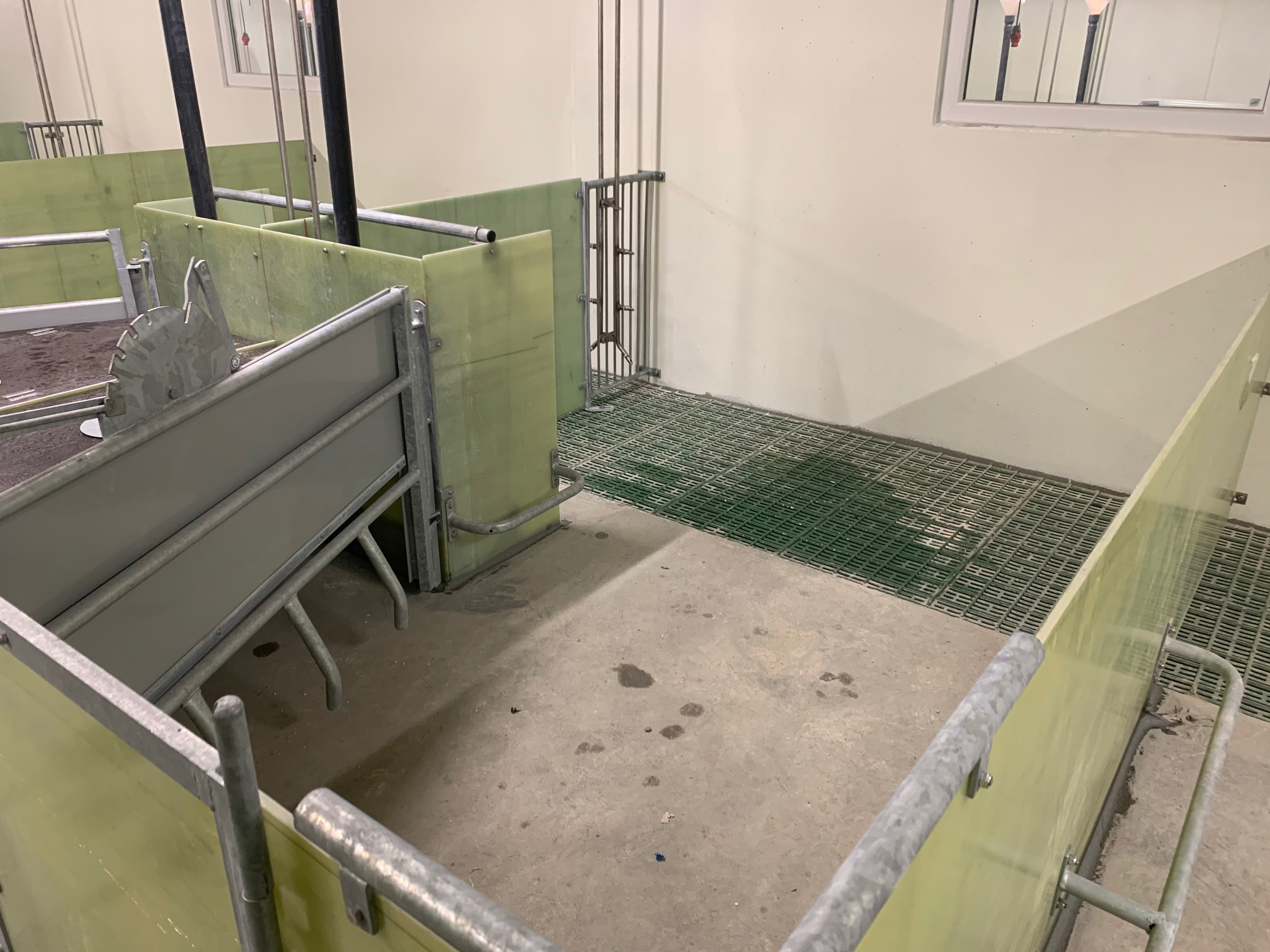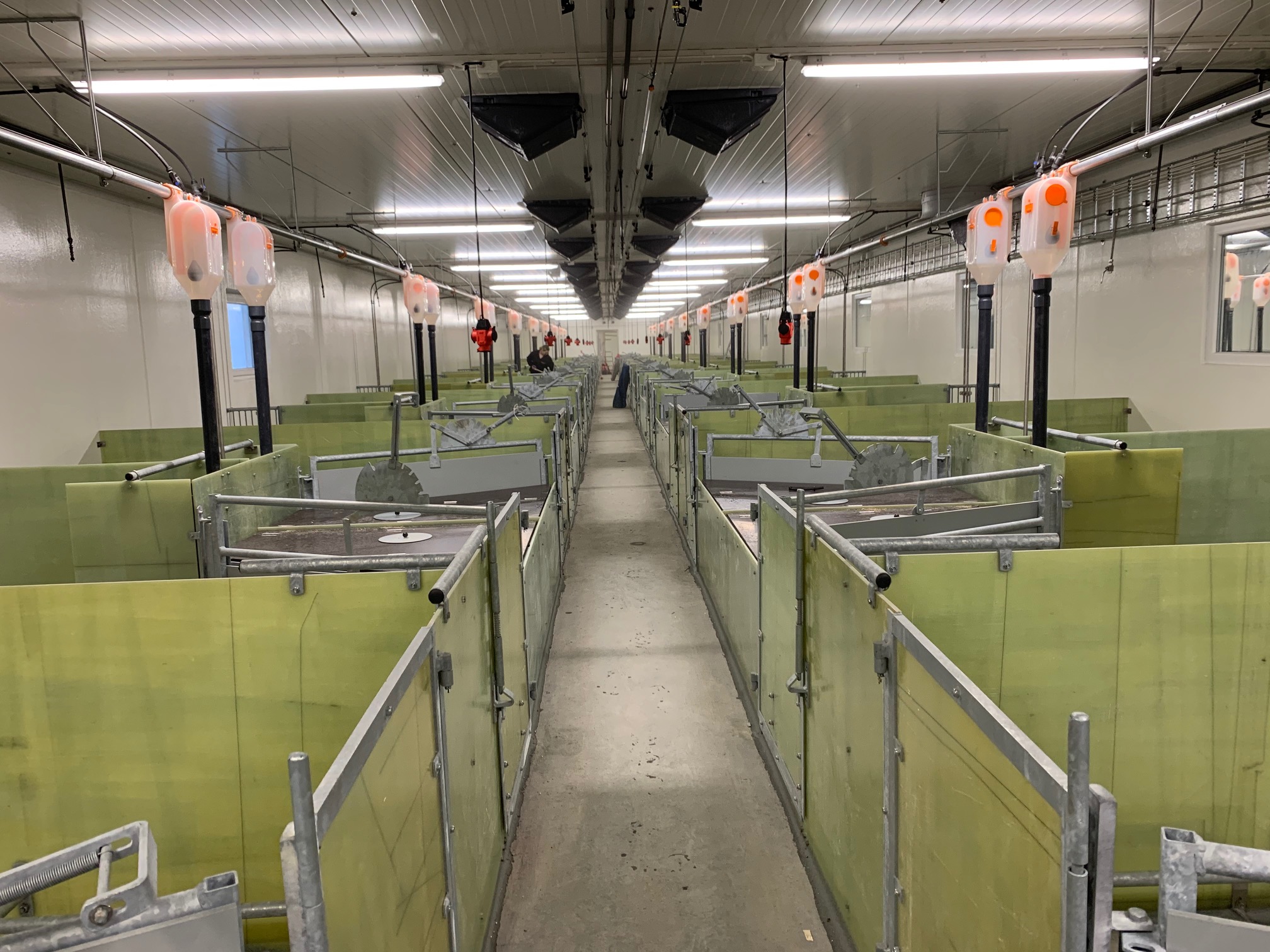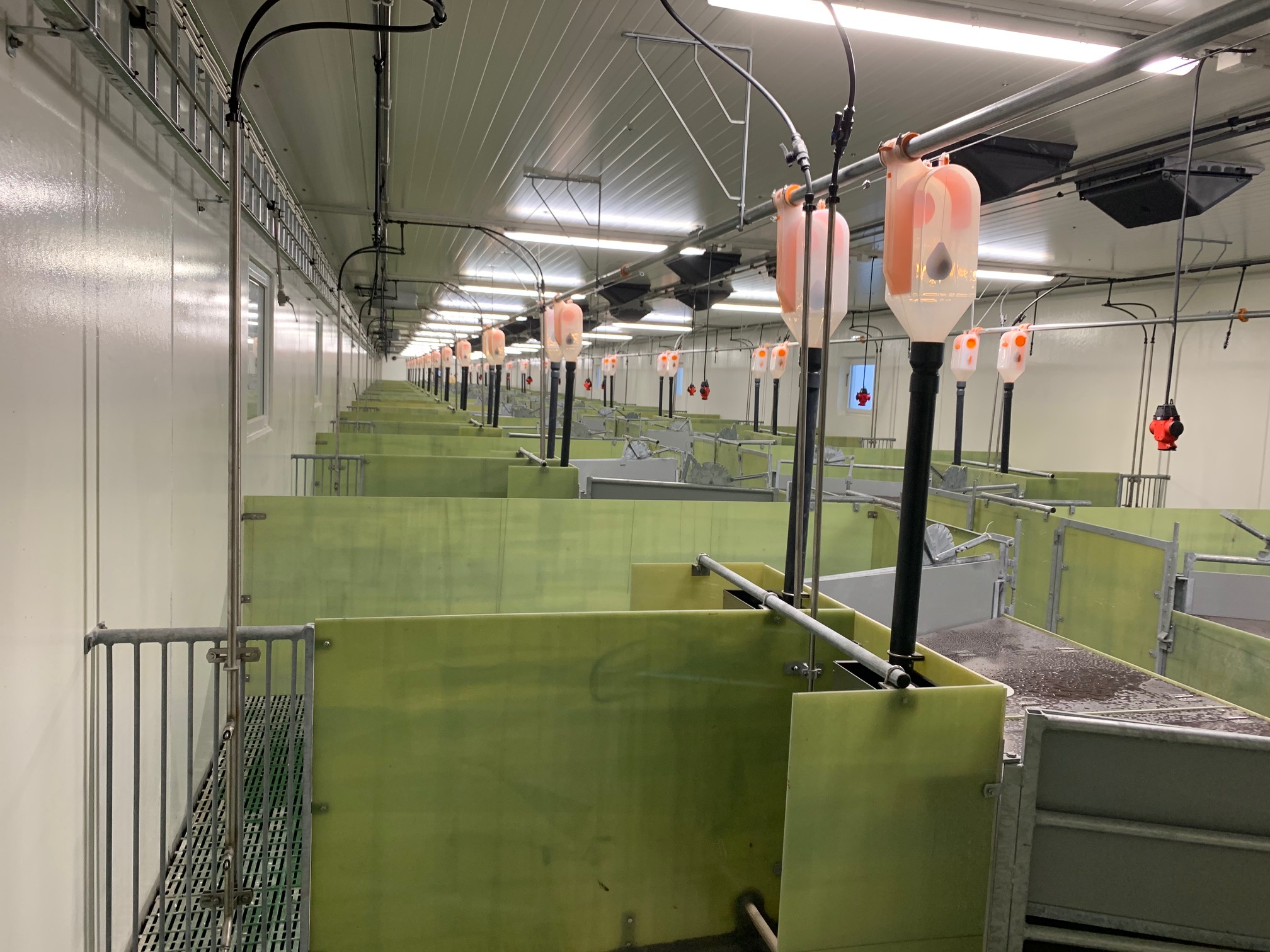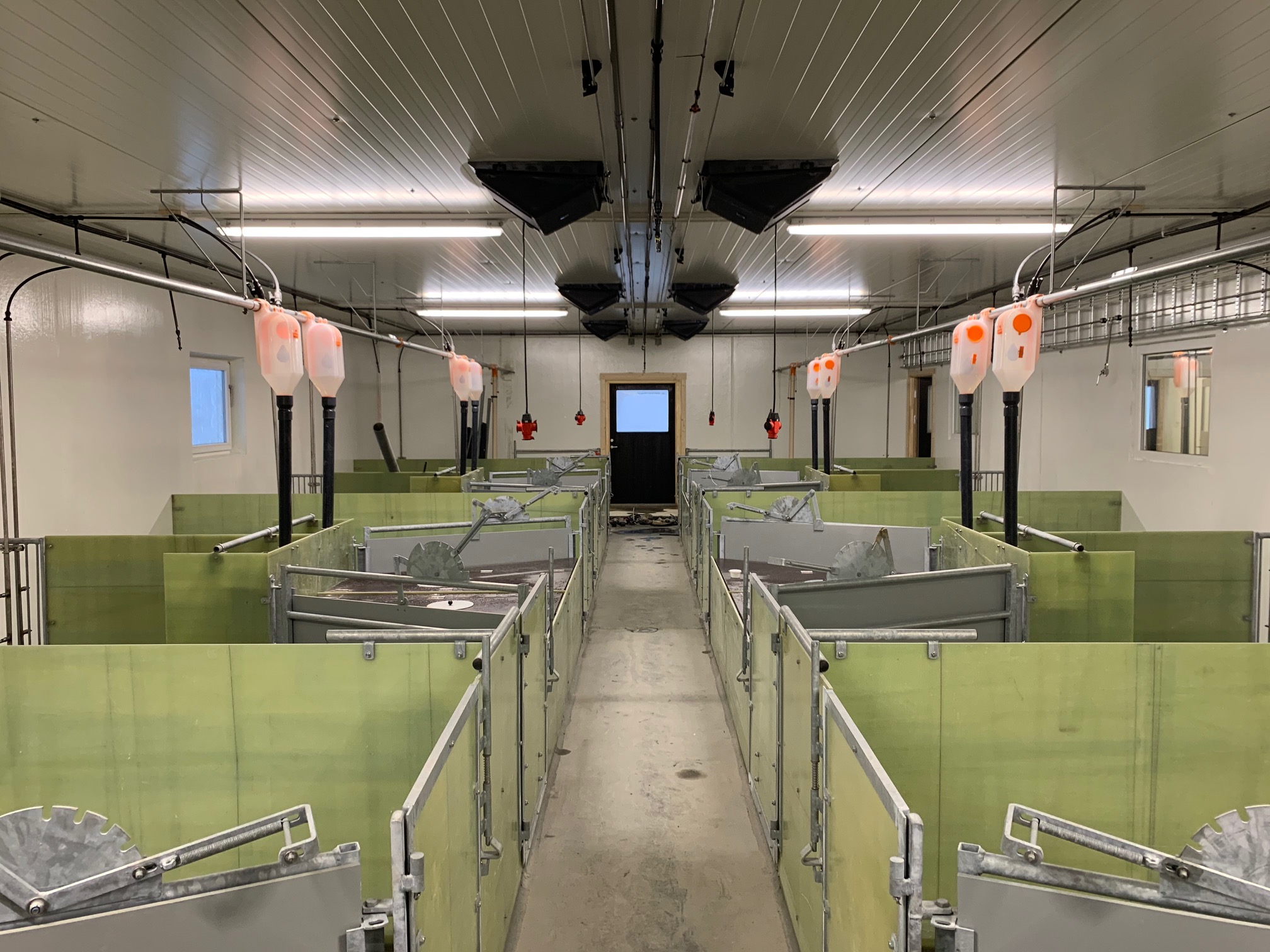 Inventar av beste sort med glassfiber inventar, Mik plastikk rister, Big Dutchman ventilasjon og fôringssystem.