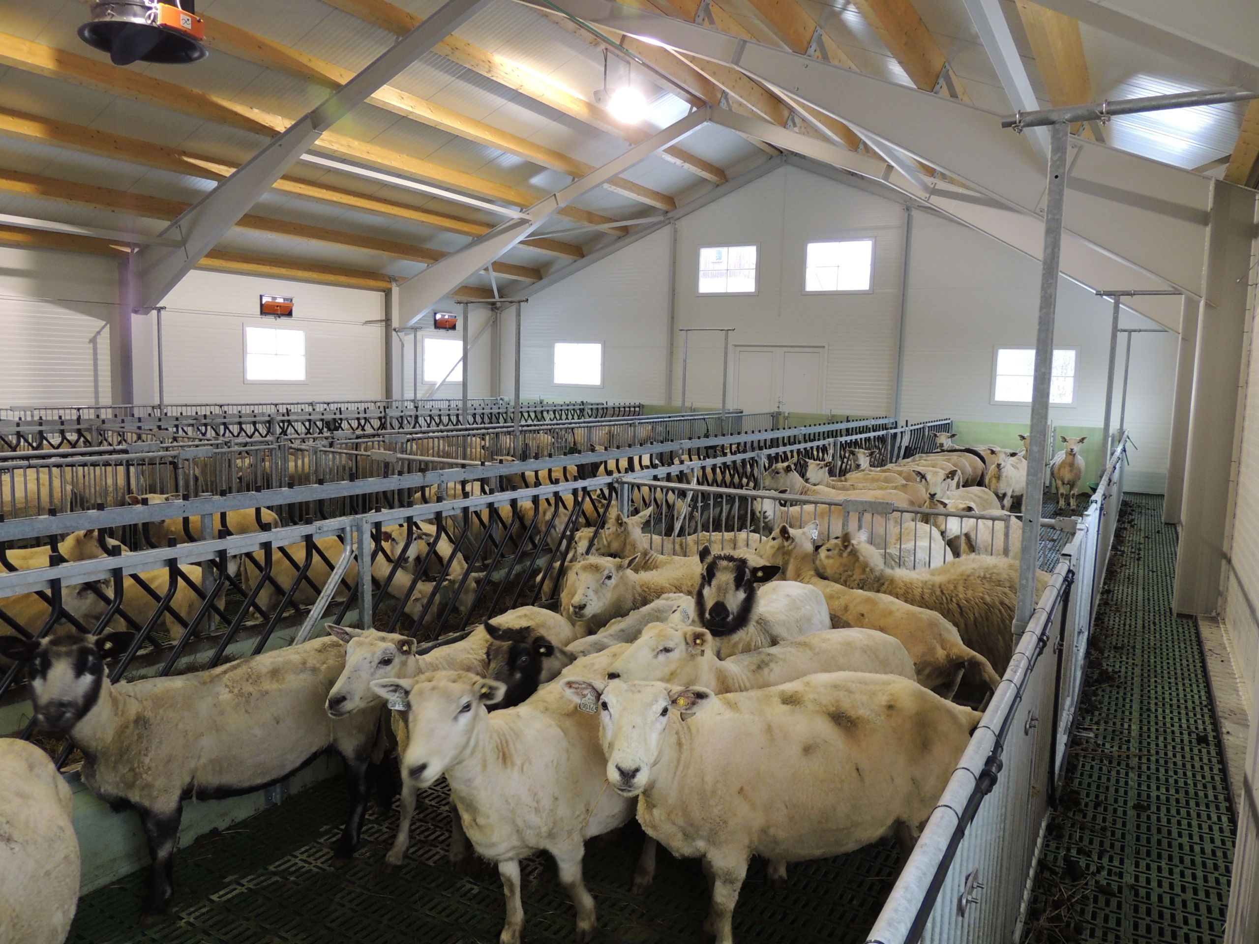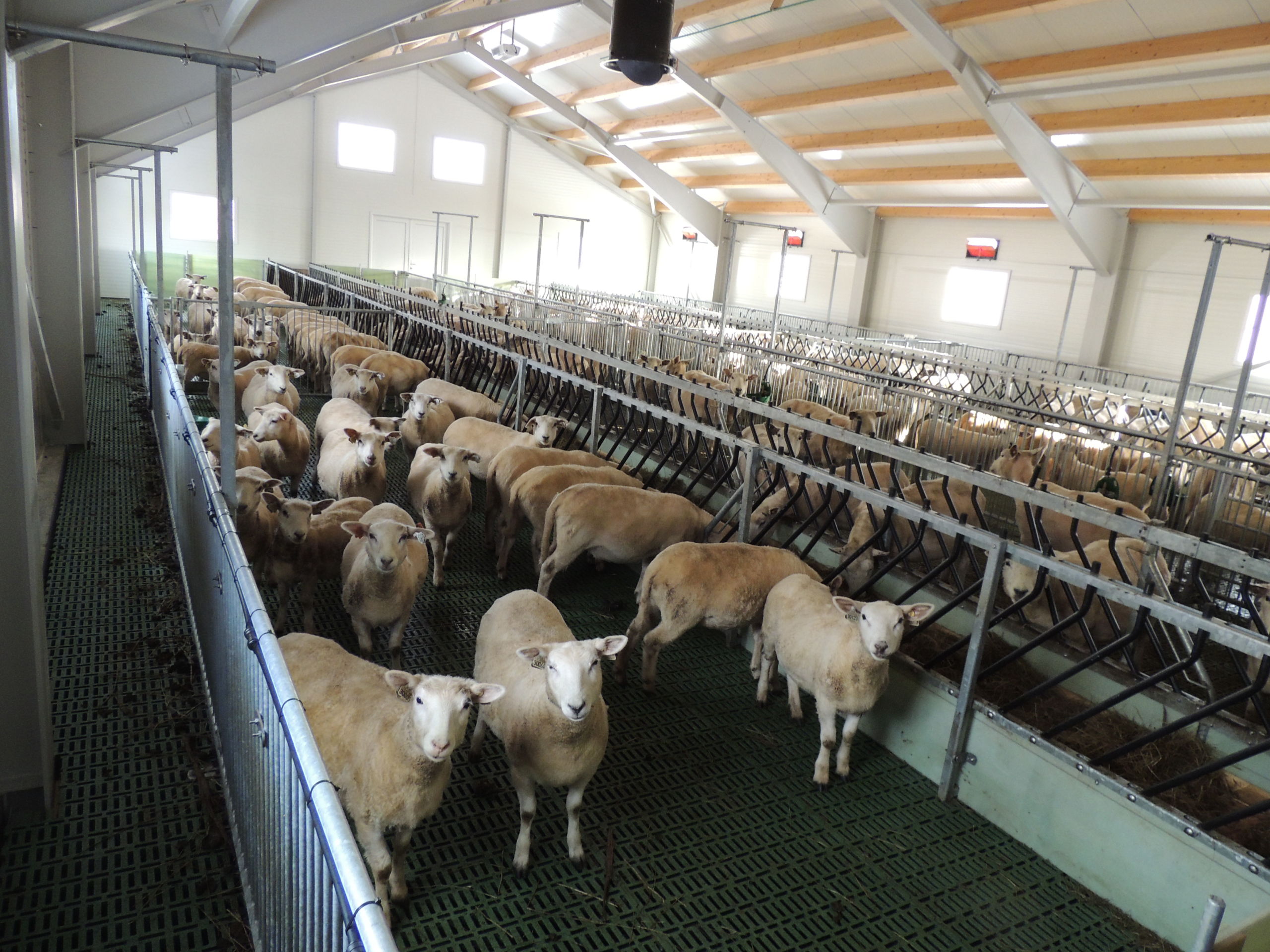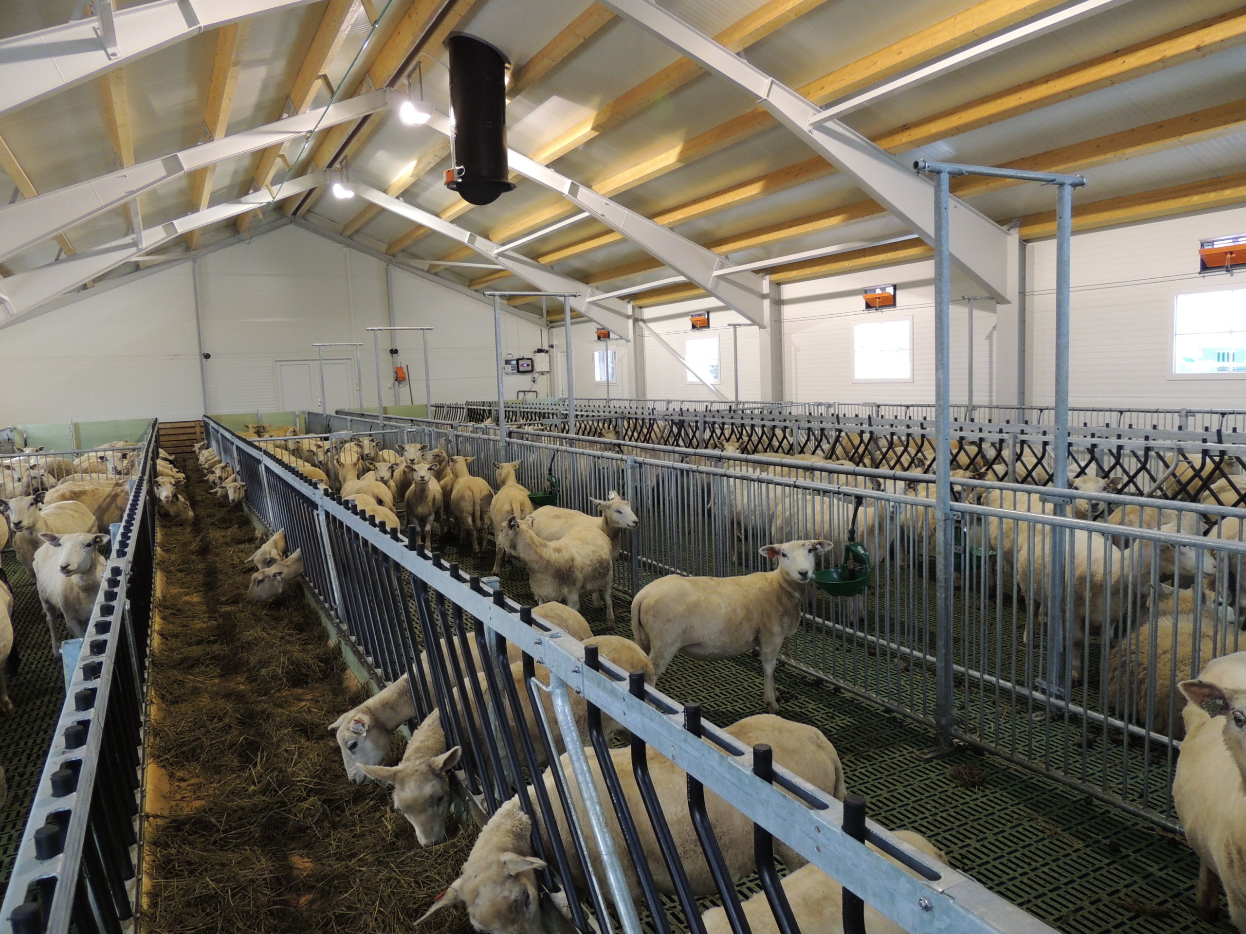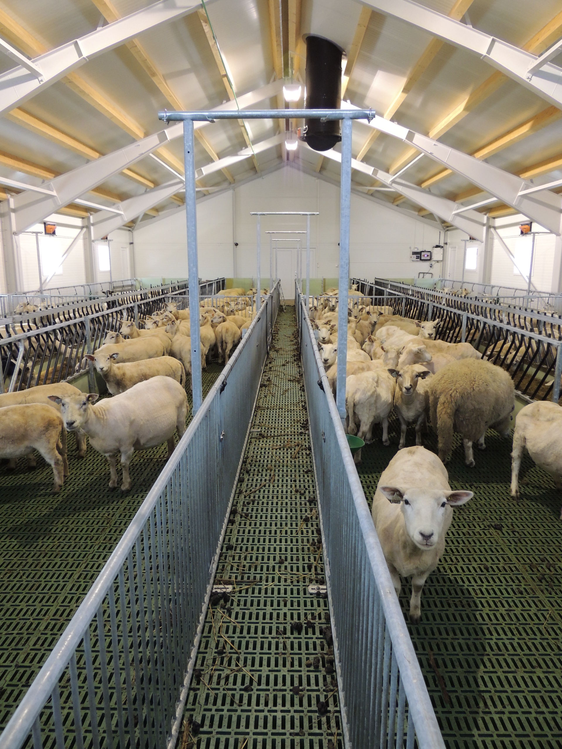 Fjøset er med stålkonstruksjon og sandwich, og er bygget over kjeller. Det er lagt Mik Stepper plastrister på stålbæring med 5 meters spenn. Det er valgt lammesikker front med glassfiber mot fôrbrett, og bingeskillene er både tette glassfiberskiller og med stående spiler. Vi har også levert Big Dutchman ventilasjon.