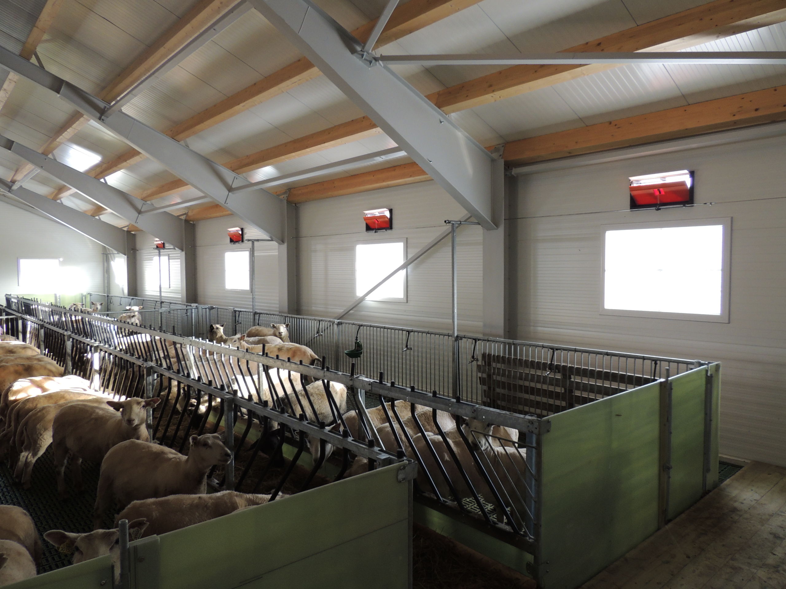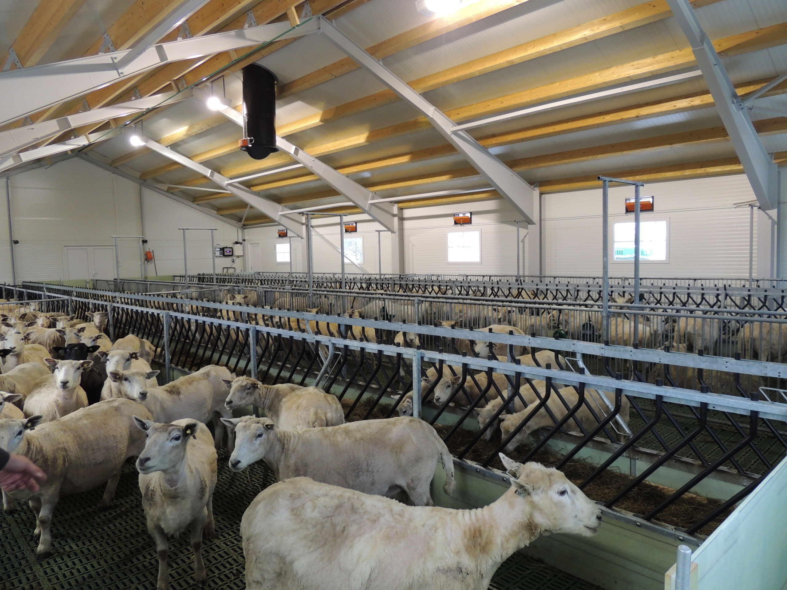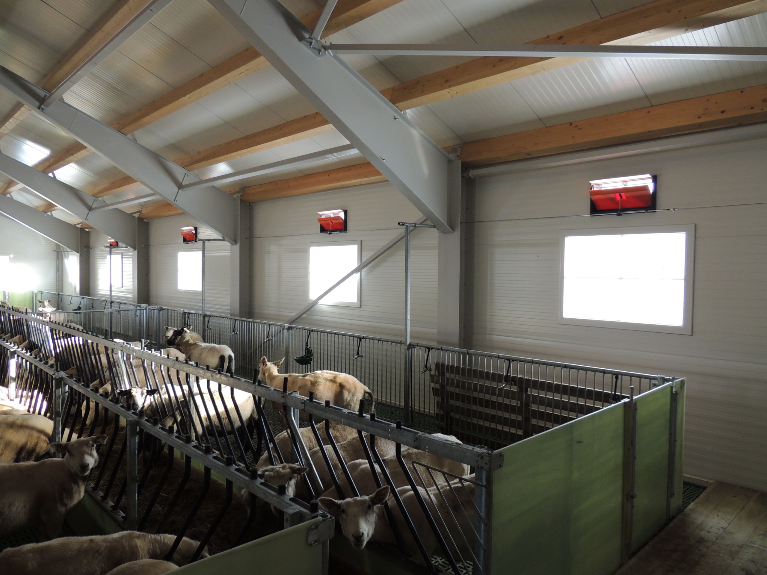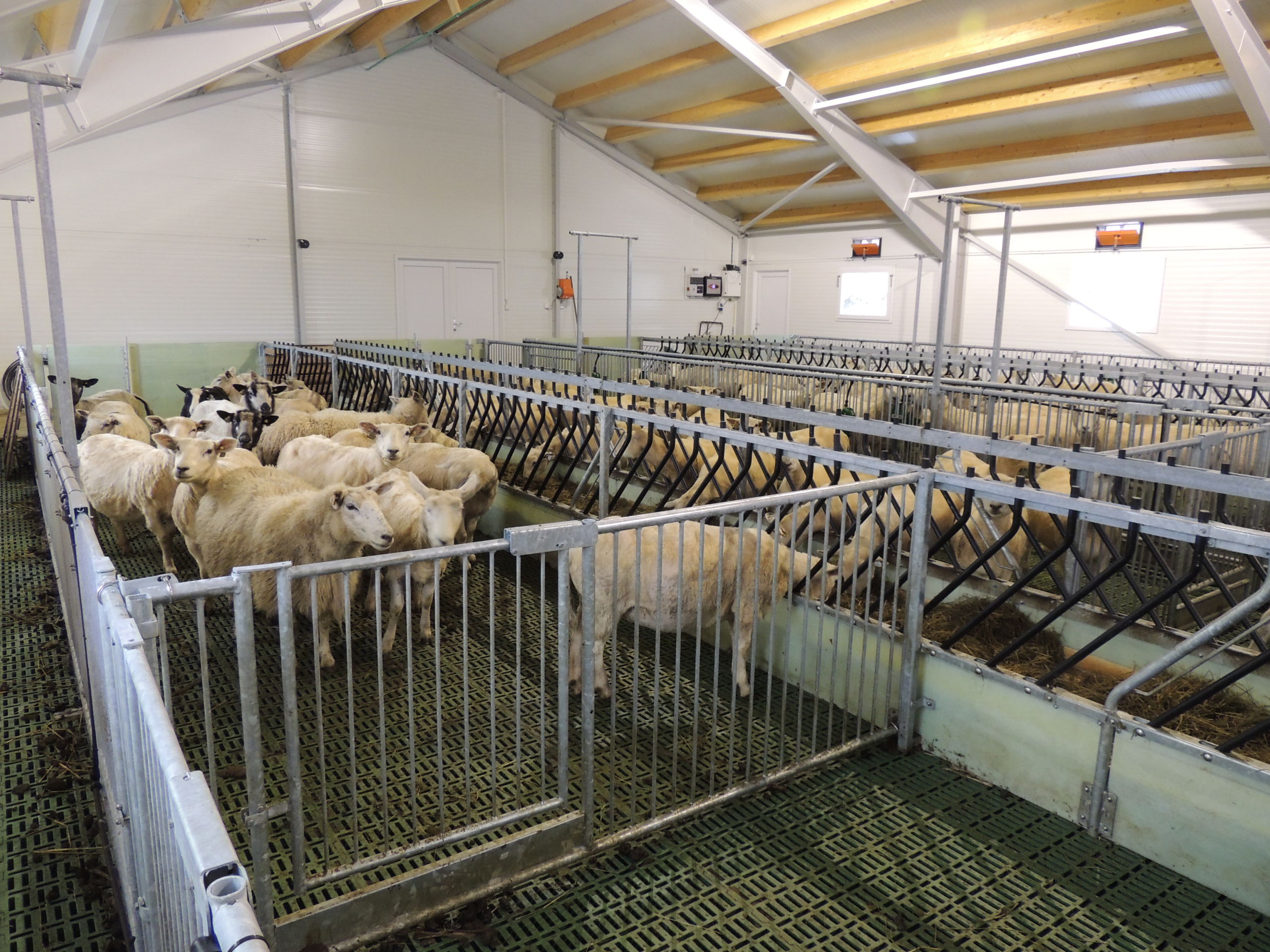 Fjøset er med stålkonstruksjon og sandwich, og er bygget over kjeller. Det er lagt Mik Stepper plastrister på stålbæring med 5 meters spenn. Det er valgt lammesikker front med glassfiber mot fôrbrett, og bingeskillene er både tette glassfiberskiller og med stående spiler. Vi har også levert Big Dutchman ventilasjon.