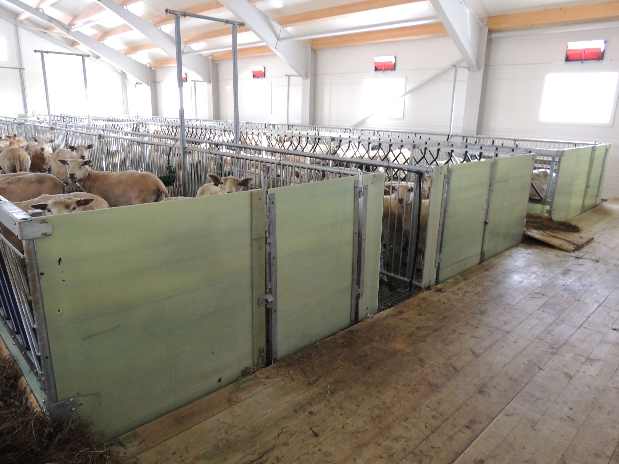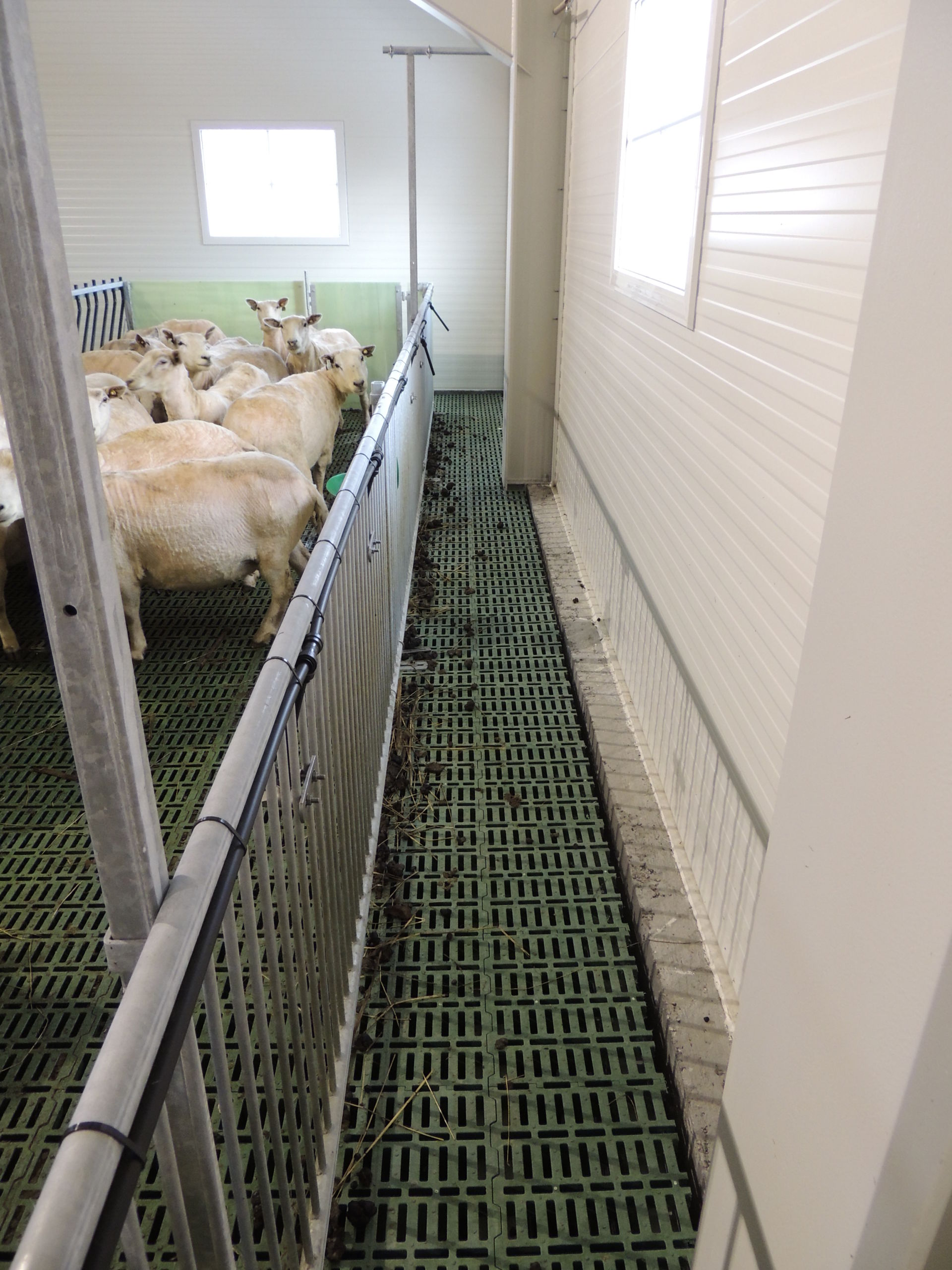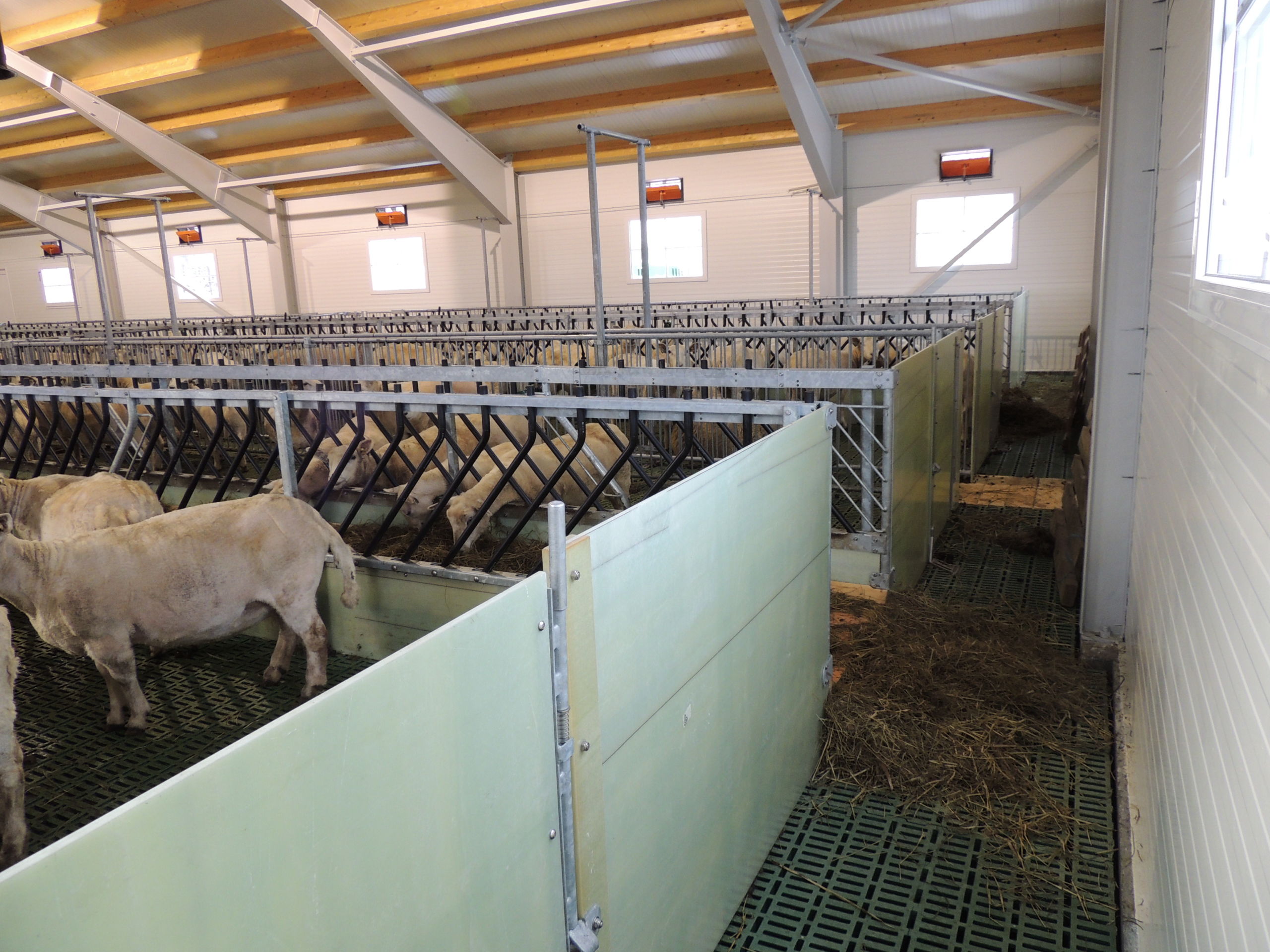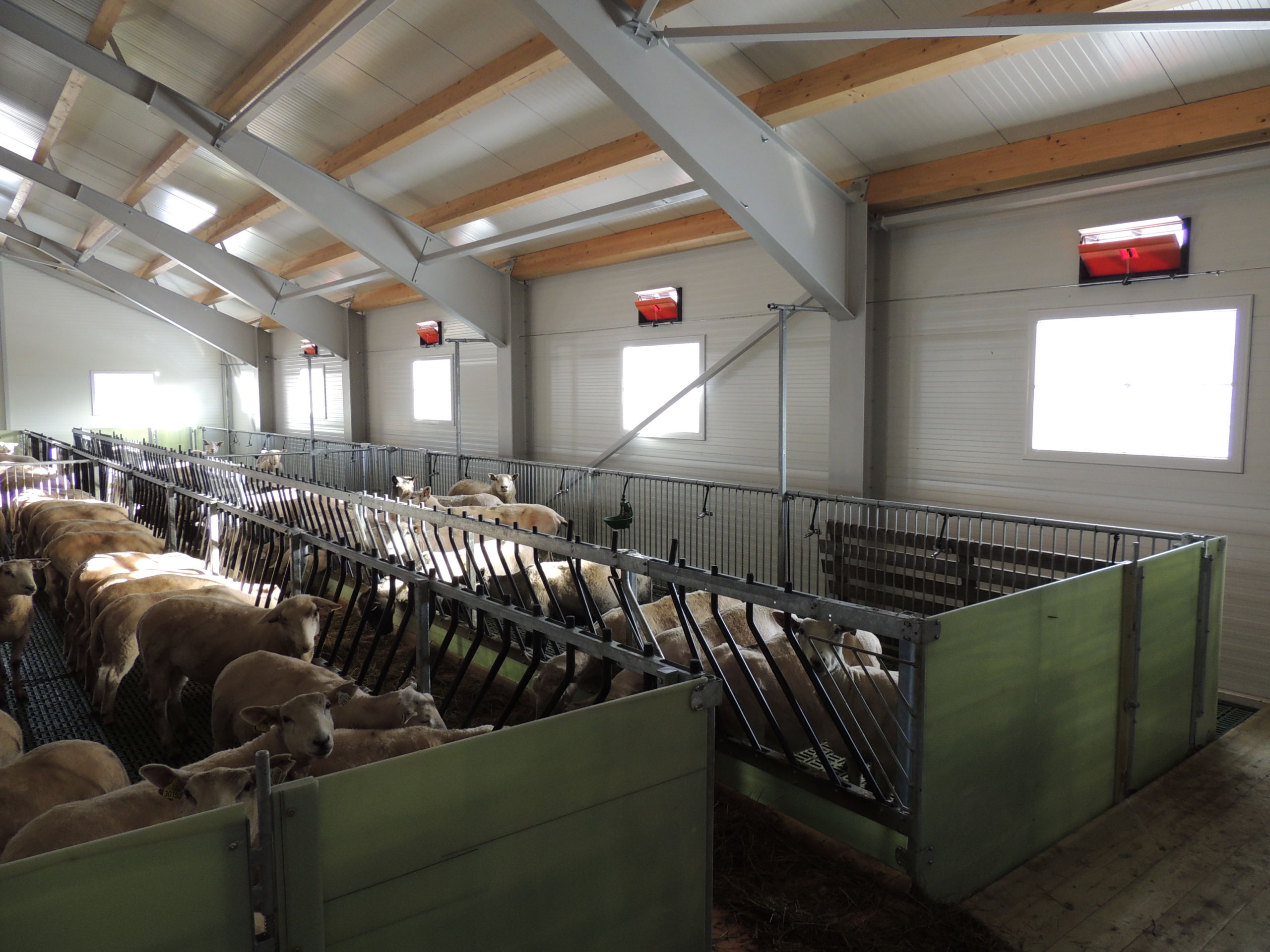 Fjøset er med stålkonstruksjon og sandwich, og er bygget over kjeller. Det er lagt Mik Stepper plastrister på stålbæring med 5 meters spenn. Det er valgt lammesikker front med glassfiber mot fôrbrett, og bingeskillene er både tette glassfiberskiller og med stående spiler. Vi har også levert Big Dutchman ventilasjon.