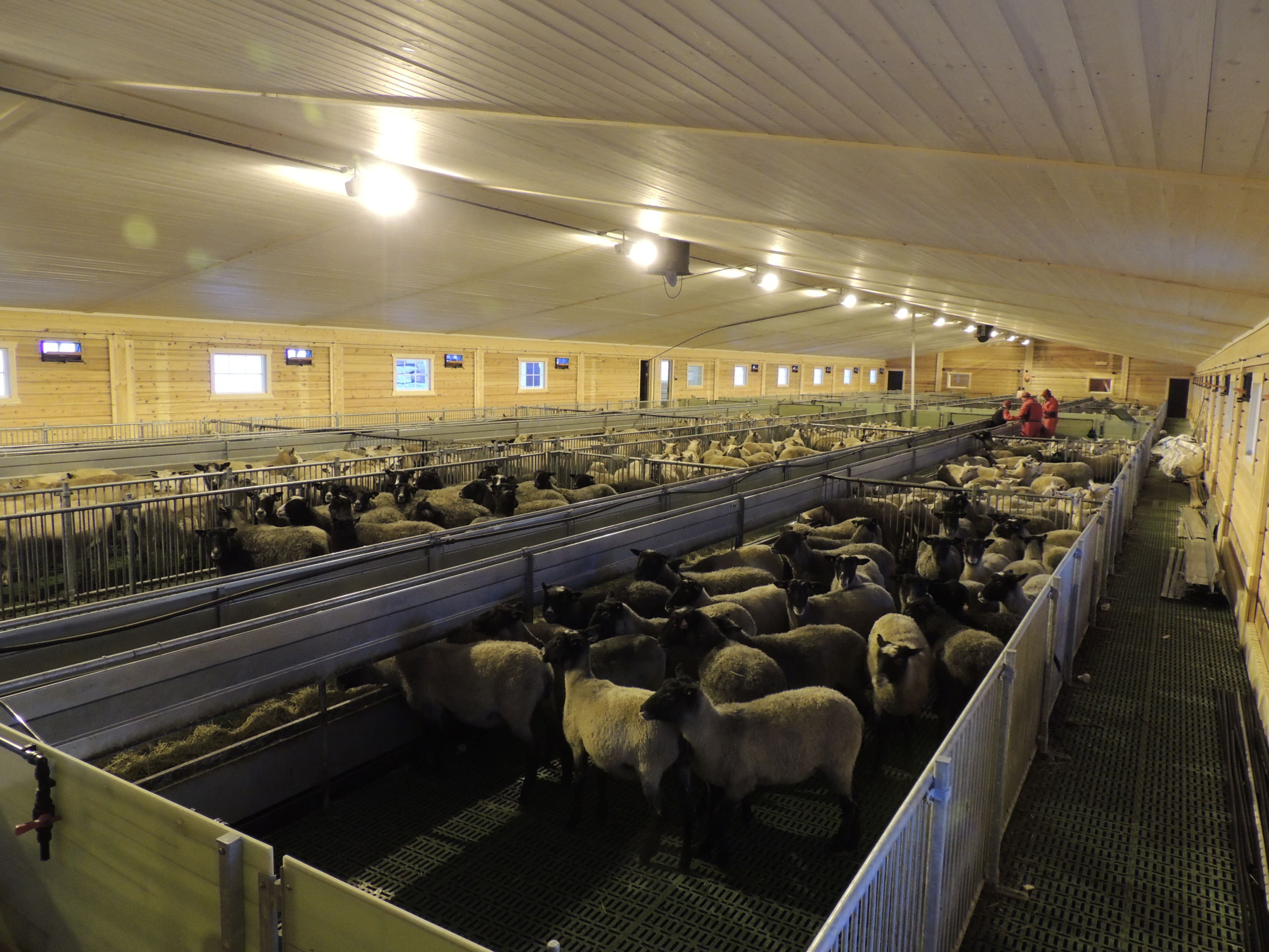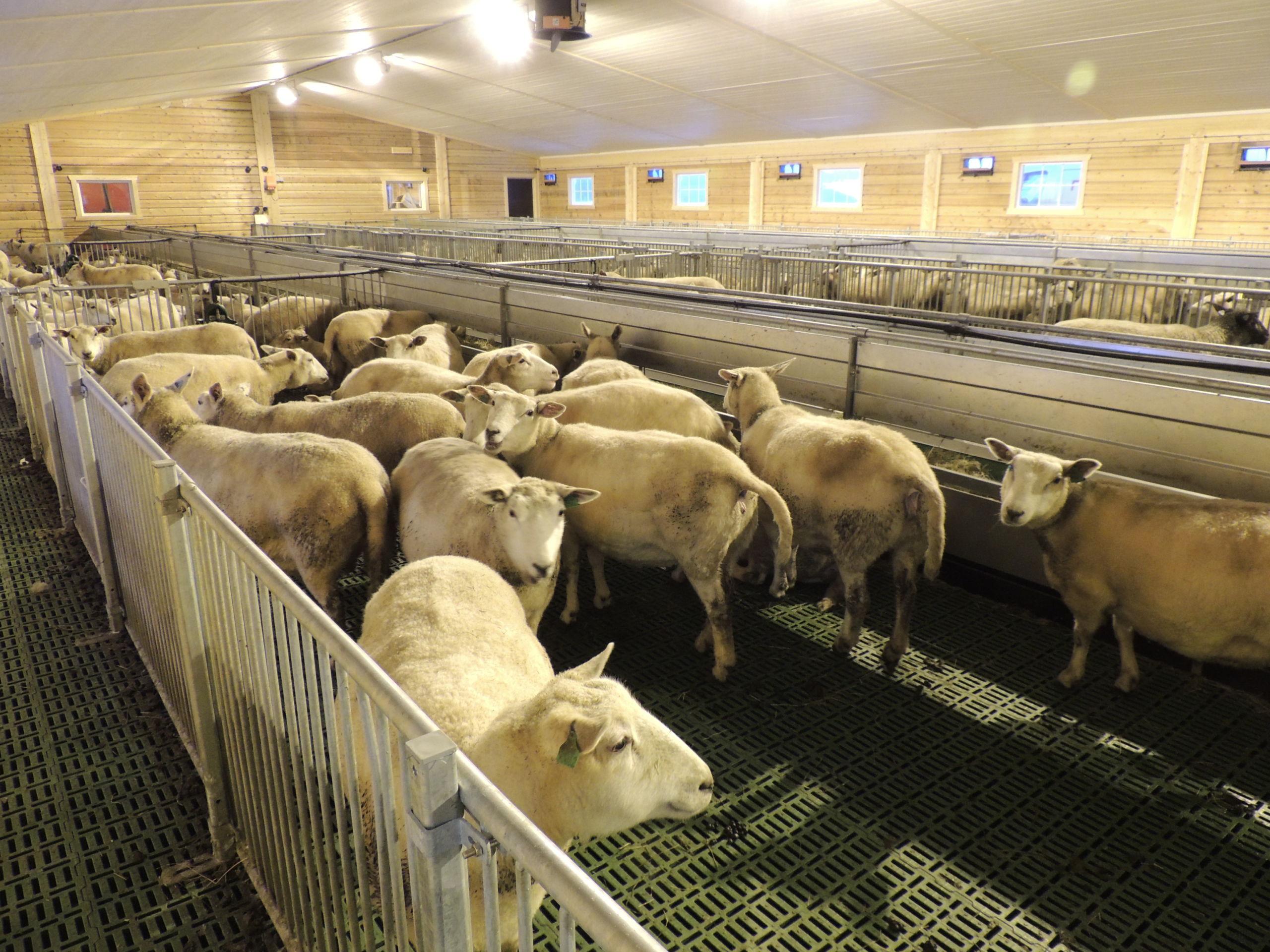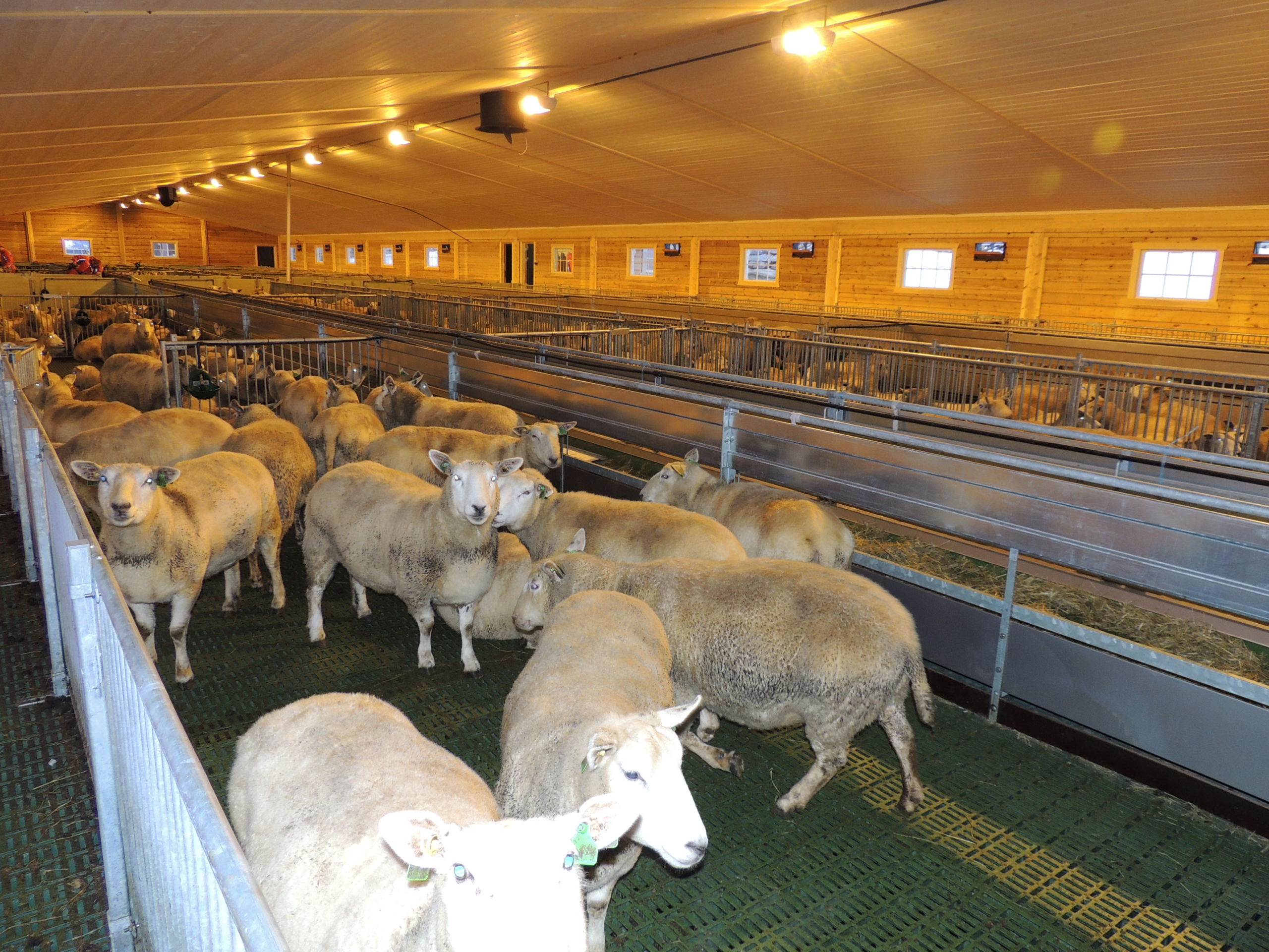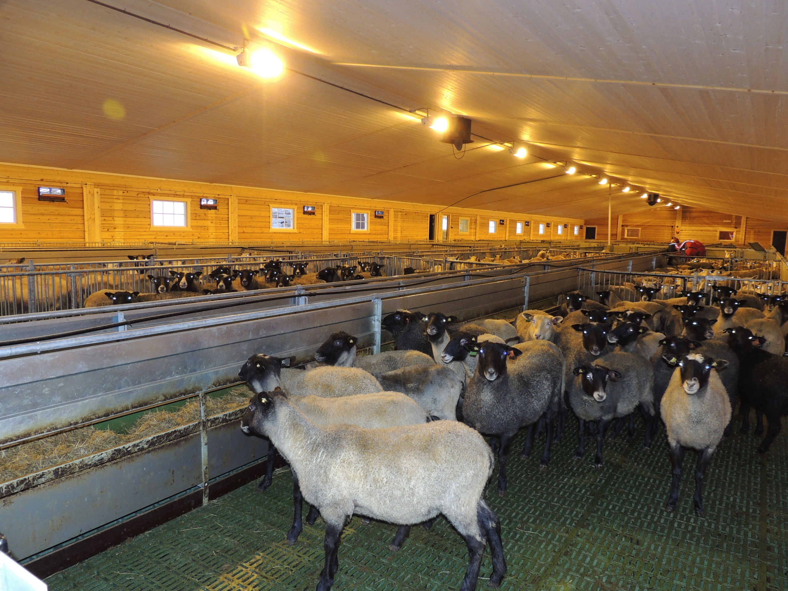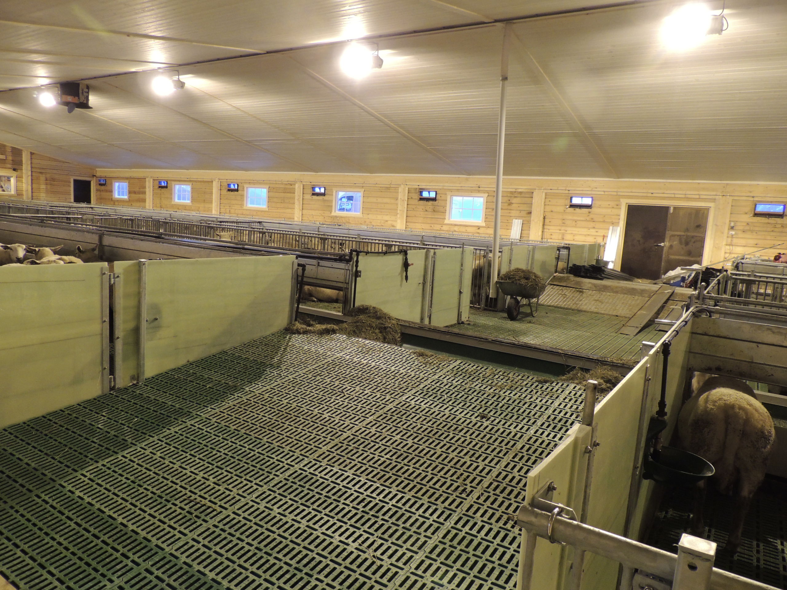Det nye fjøset er på 64,2m x 15,8m, og har plass til ca 600 sau. Det er MIK Stepper plastrister over hele arealet. Rullende fôrbrett med overgang i midtgang. Bingeskiller med stående spiler og tette glassfiberskiller i ender. Vi har også levert lammegrinder. Big Dutchman ventilasjon, og drikkekar fra Suevia. Lammedrikkeautomater vil også bli tatt i bruk.