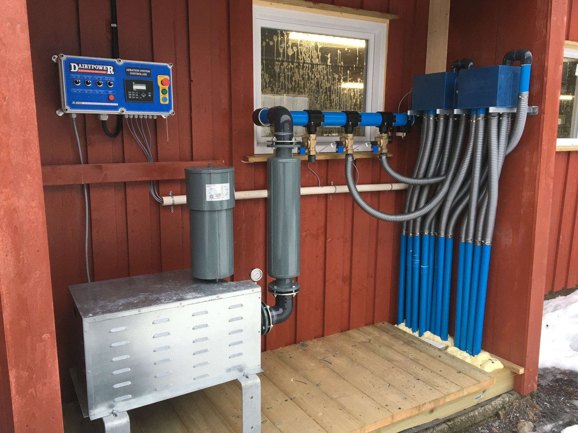 Det gamle båsfjøset i Flatdal som Tore Mæland nå har renovert og bygd om til okser, har en kjeller med grunnflate på 430 m2. Kjelleren hadde allerede en søylerekke i senter, men pga fornying av dragere i delen med fullspaltebinger, ble det ytterligere noen søylepunkter. Utfordringen er å få rørt om og holde homogen konsistens på gjødsla. FS Luftomrøring løser dette med tilsetting av luft i gjødsla. En kompressor tilfører luft via rotorventiler, som igjen fordeler lufta i de ulike rørgatene og blåser luft inn i gjødsla med lavt trykk ut via dyser på gulvnivå. Anlegget hos Mæland har 165 luftdyser og alle rørgater festes med syrefast festemateriell.