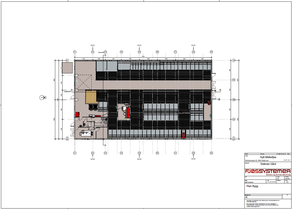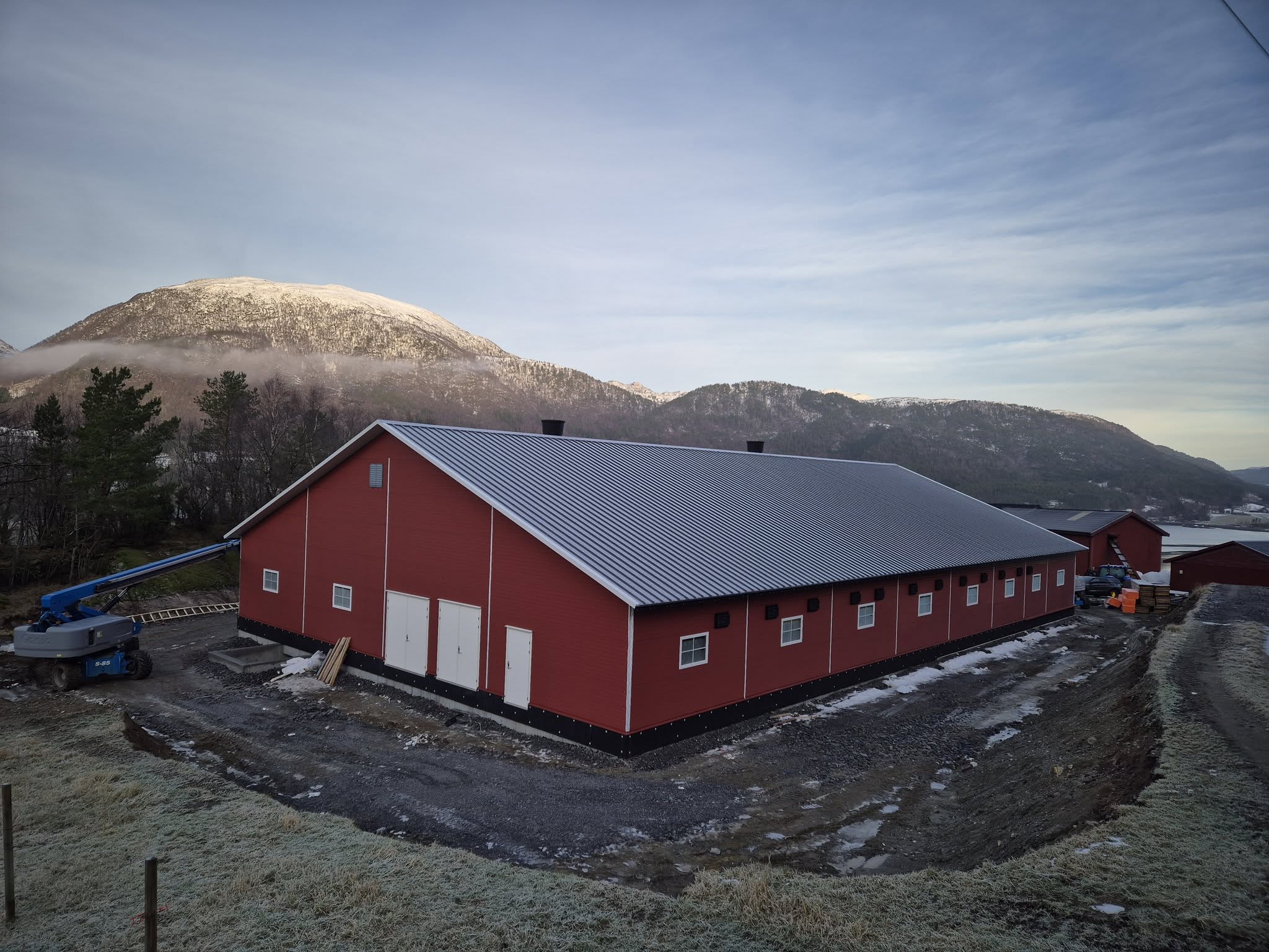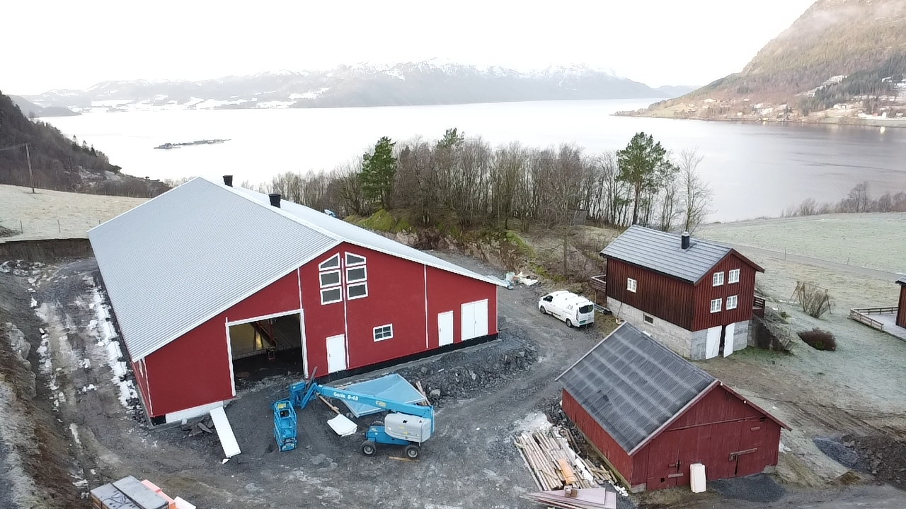 Fjøssystemer Bygg leverer stålkonstruksjon, limtreåser, vegg og takpanel i sandwich med dører, vinduer og port. Innvendige servicerom er bygd med sandwich.