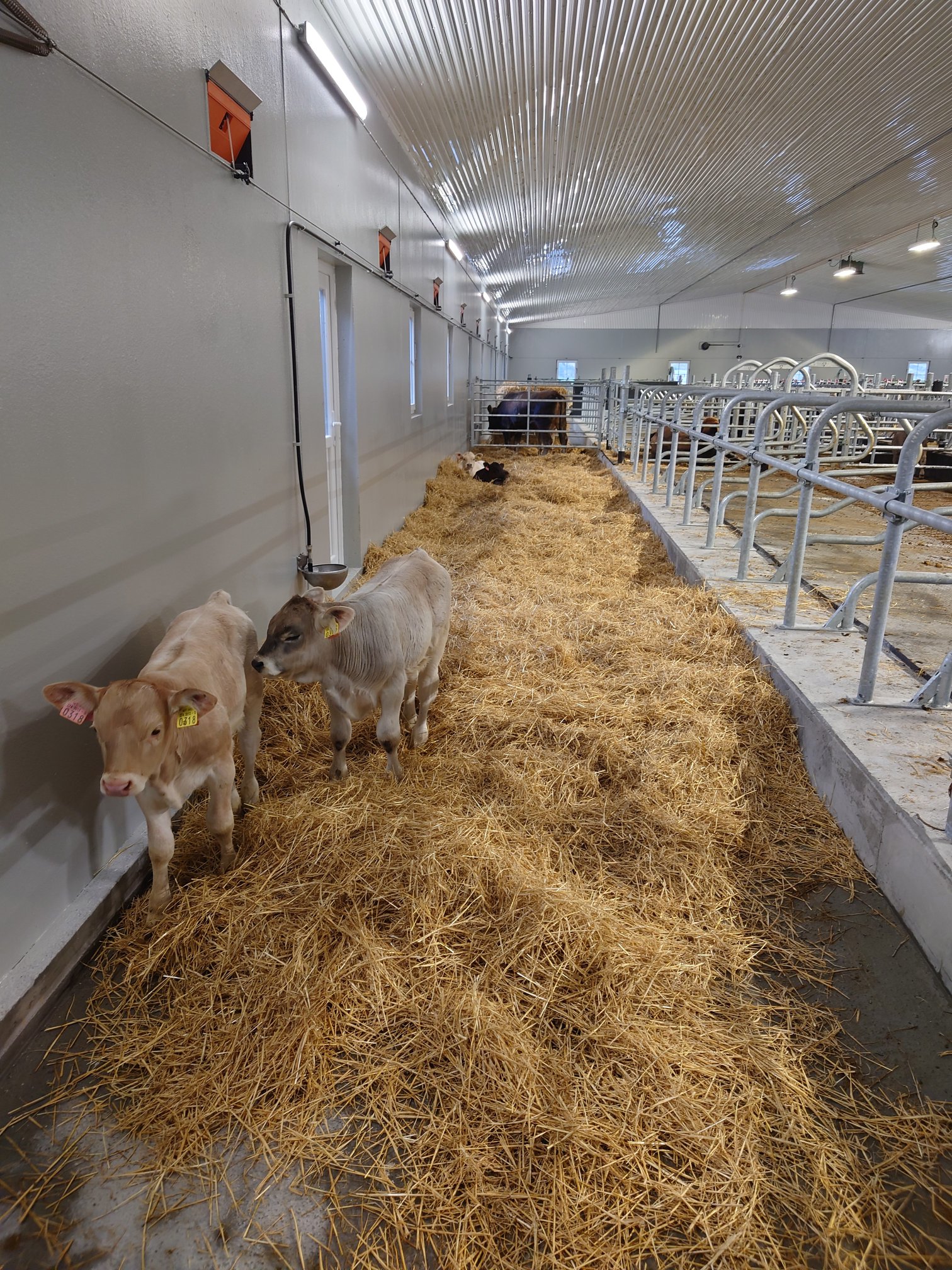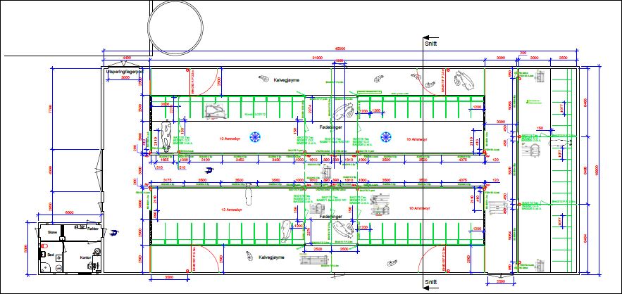 Det er blitt fokusert på god plass til kalvene så på hver side er det ei stor kalvegjømme. Fødebinger er plasser strategisk til sentralt i bygg, og en har også mulighet for å åpne disse bak til dypstrøarealet ved behov.