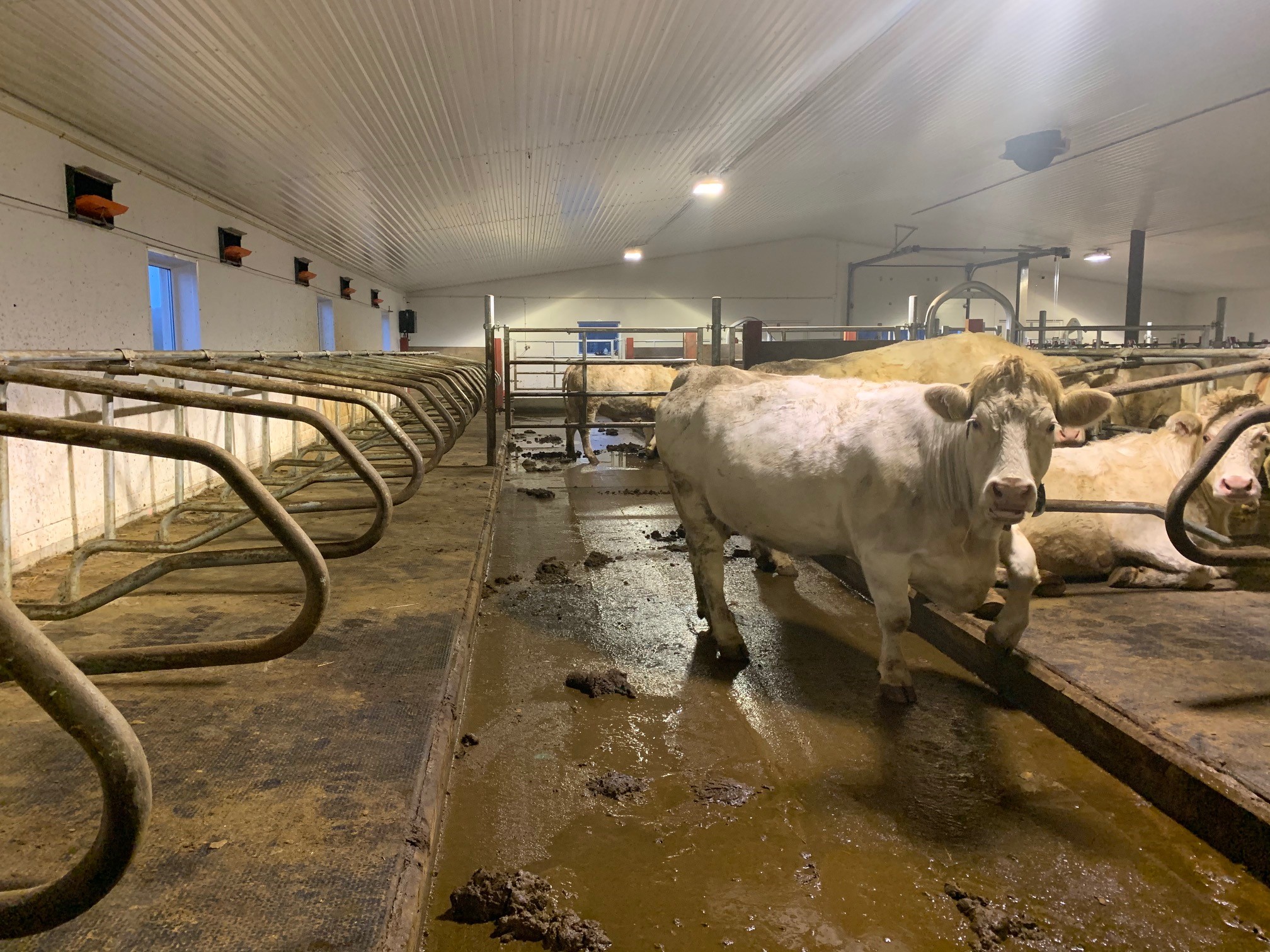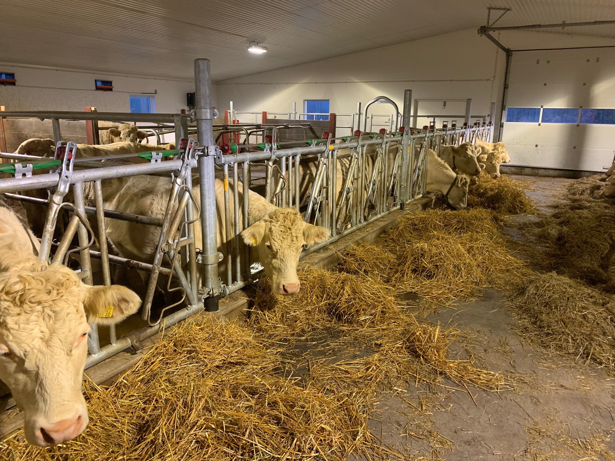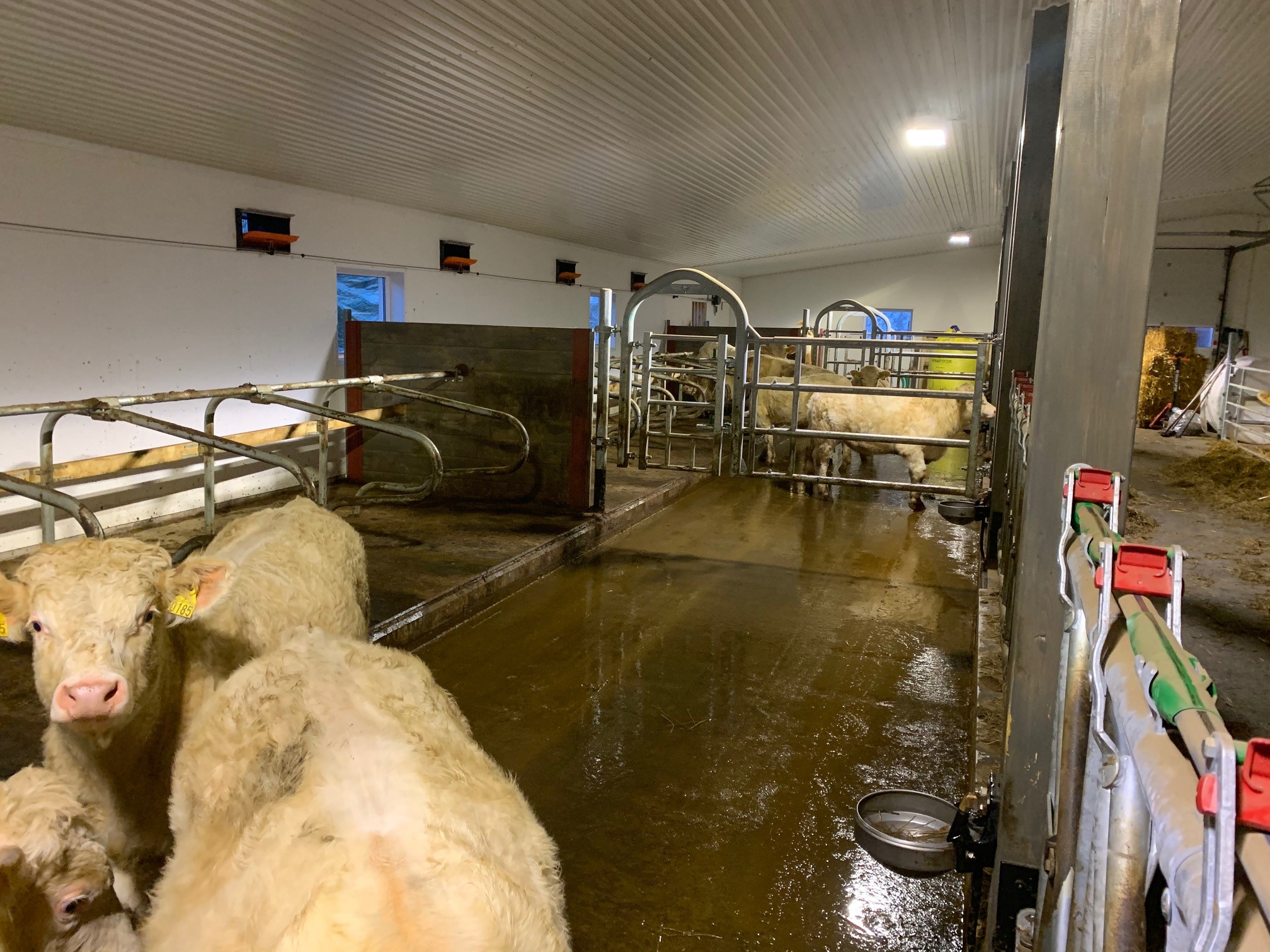 Fjøset er har båser til ammekuer og full oppfôring av kalvene. Det er avsatt god plass til en fødeavdeling.
