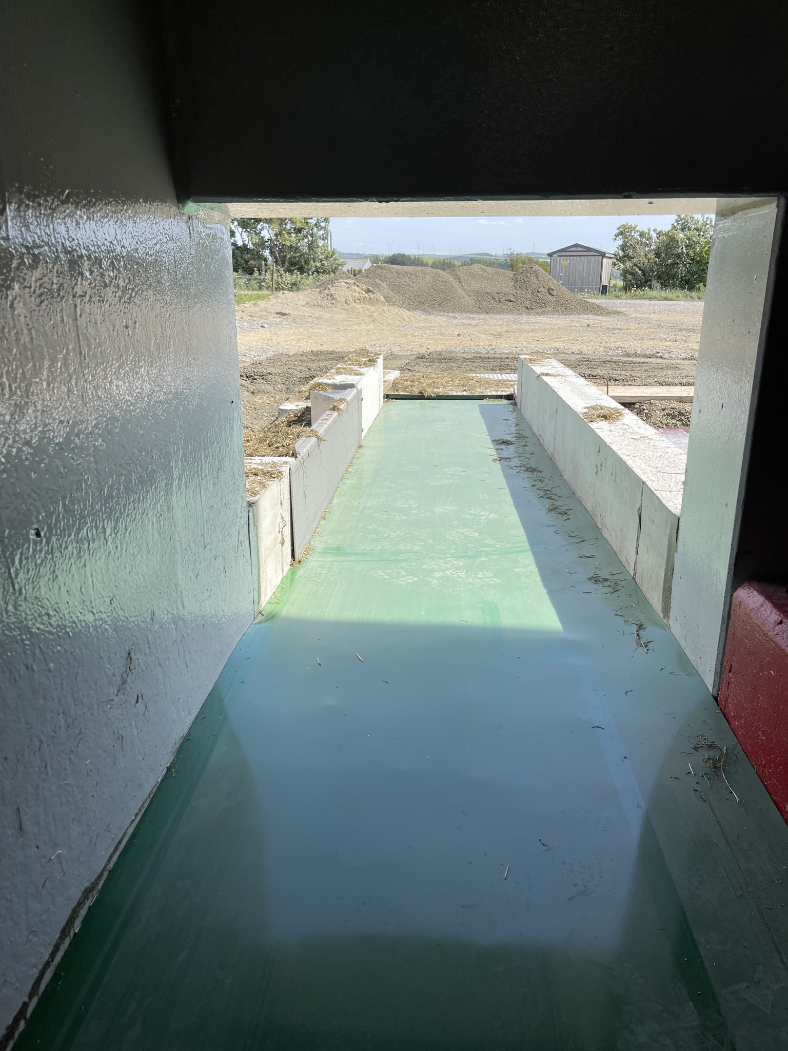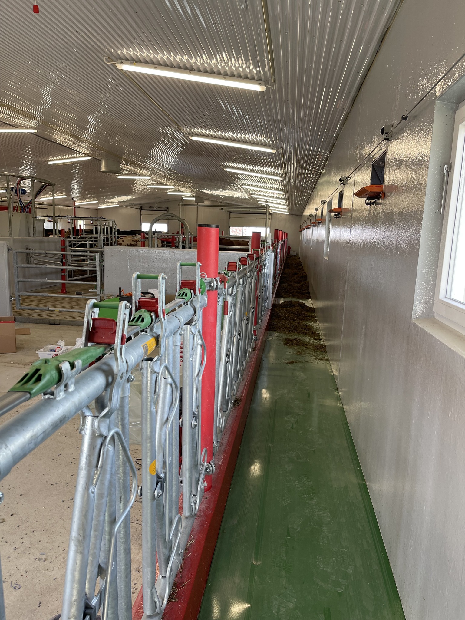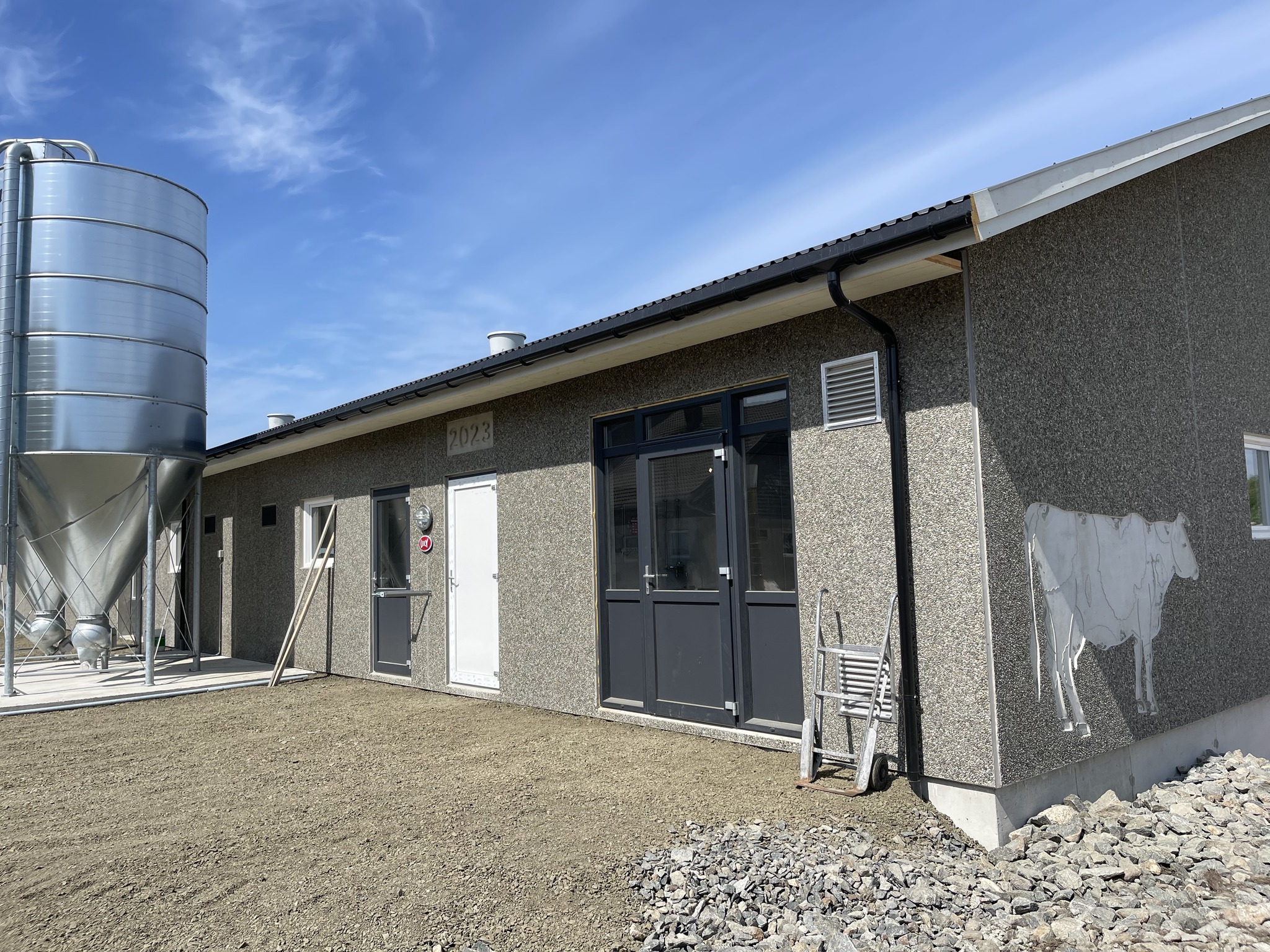 Etter mange runder med planlegging endte vi til slutt opp et frittstående melkekufjøs. Fjøset har en fleksibel løsning med enkel foring. Kalving i en stor halmbinge.