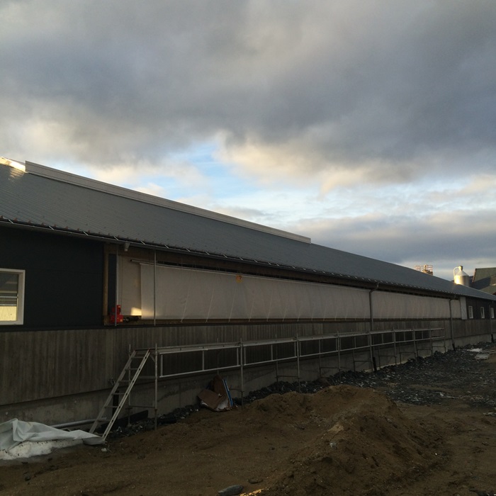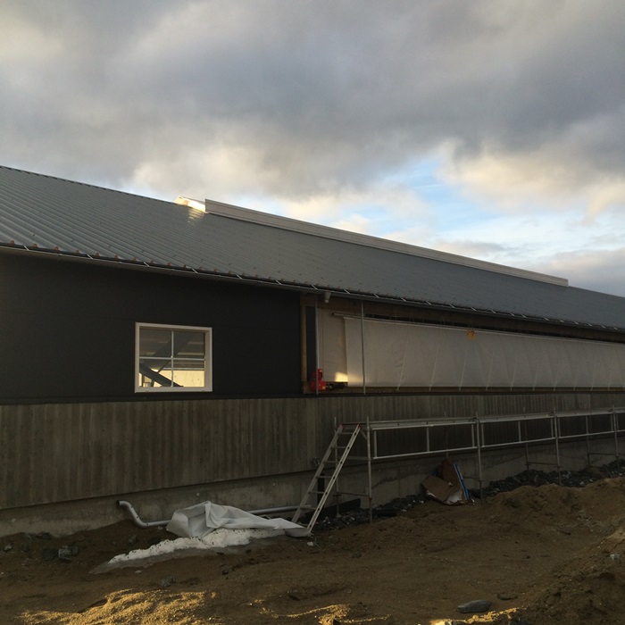 Fjøset er oppført i stålkonstruksjoner, og har sandwich på vegg. Det blir naturlig ventilasjon, noe som gir et svært godt klima for dyra.