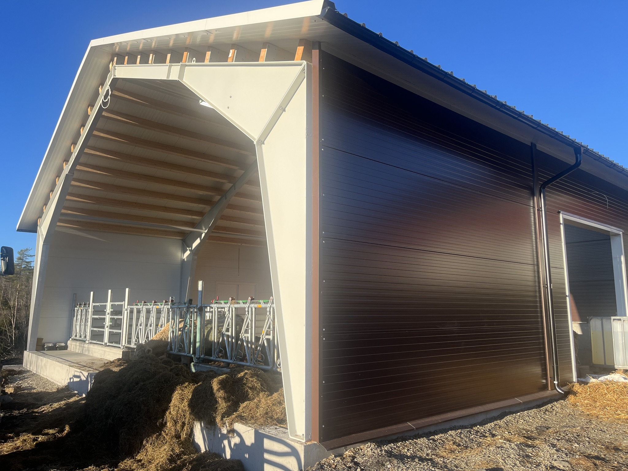 Vi har levert et nytt frittstående sau- og ammekufjøs til Henriette og Odd Kristoffer Engum. Bygget er oppført i Sandwich og stål.