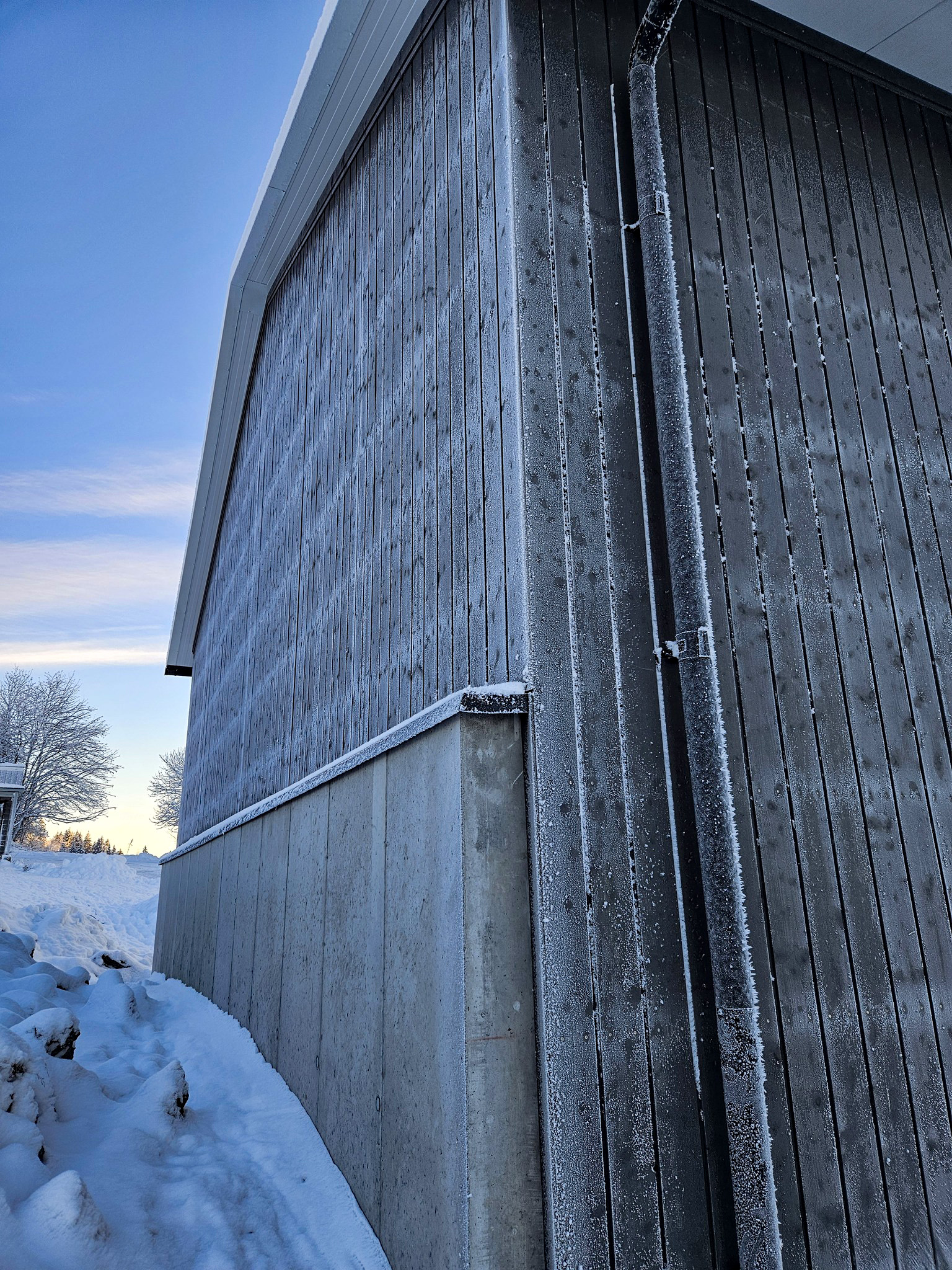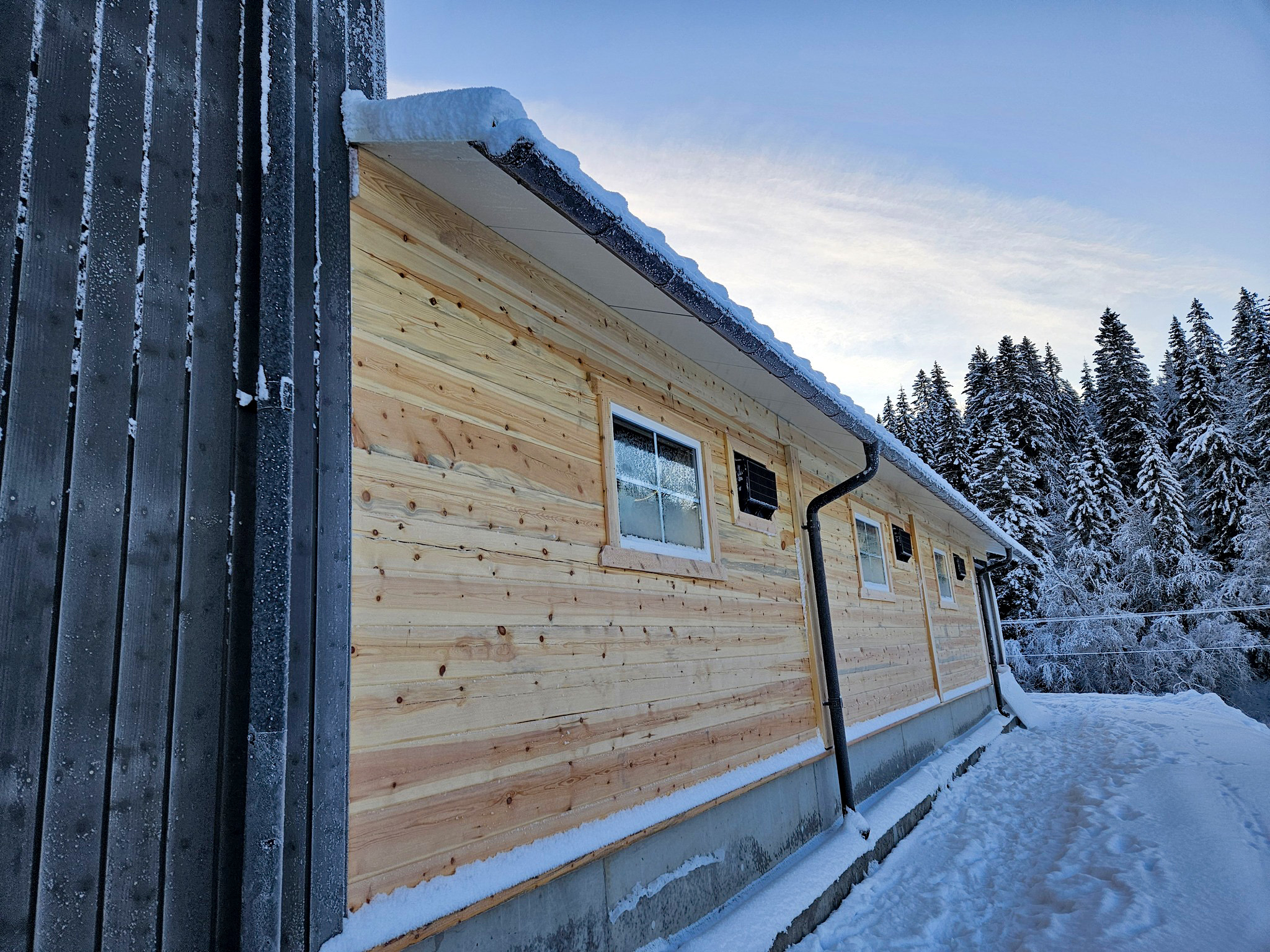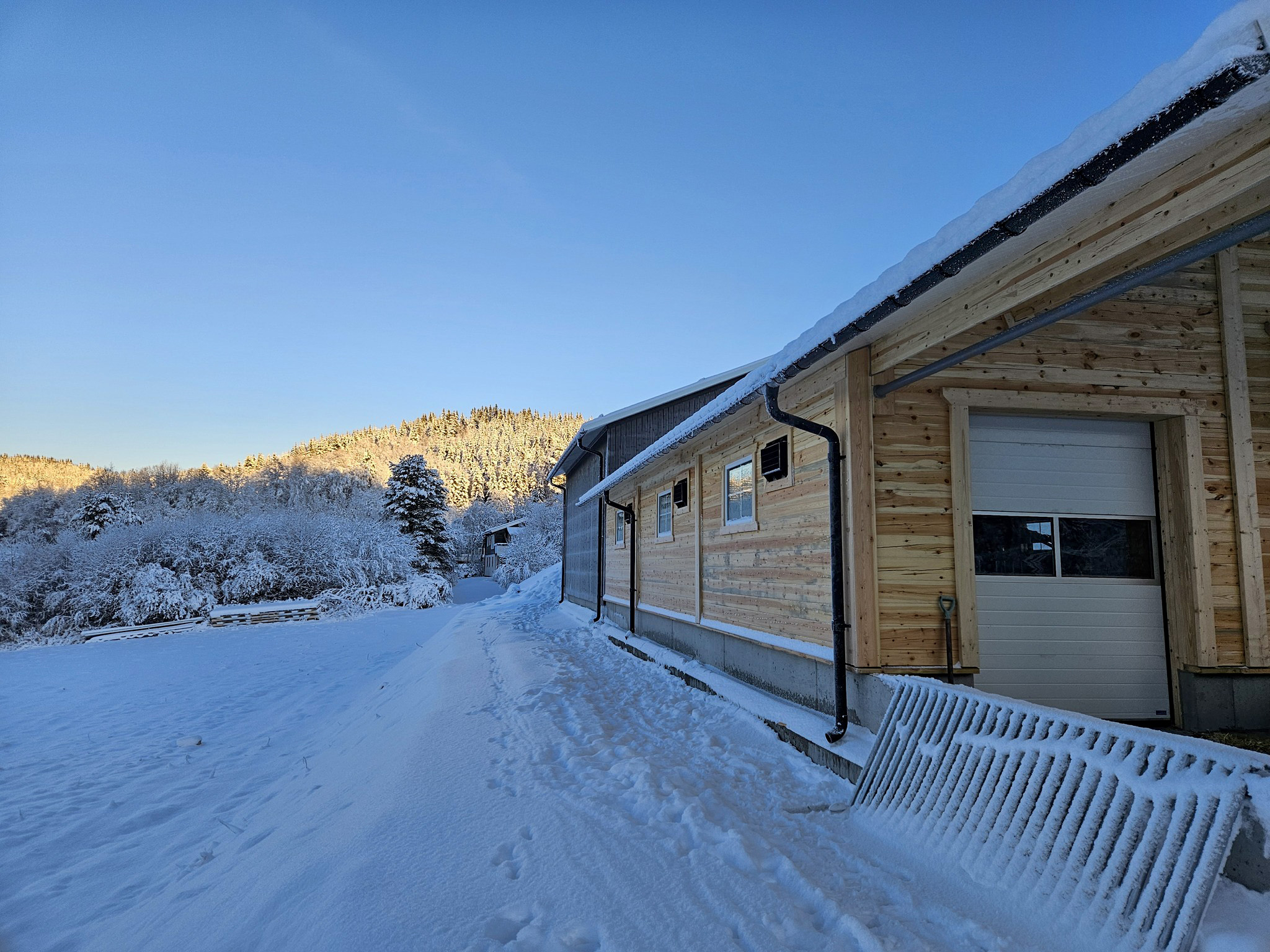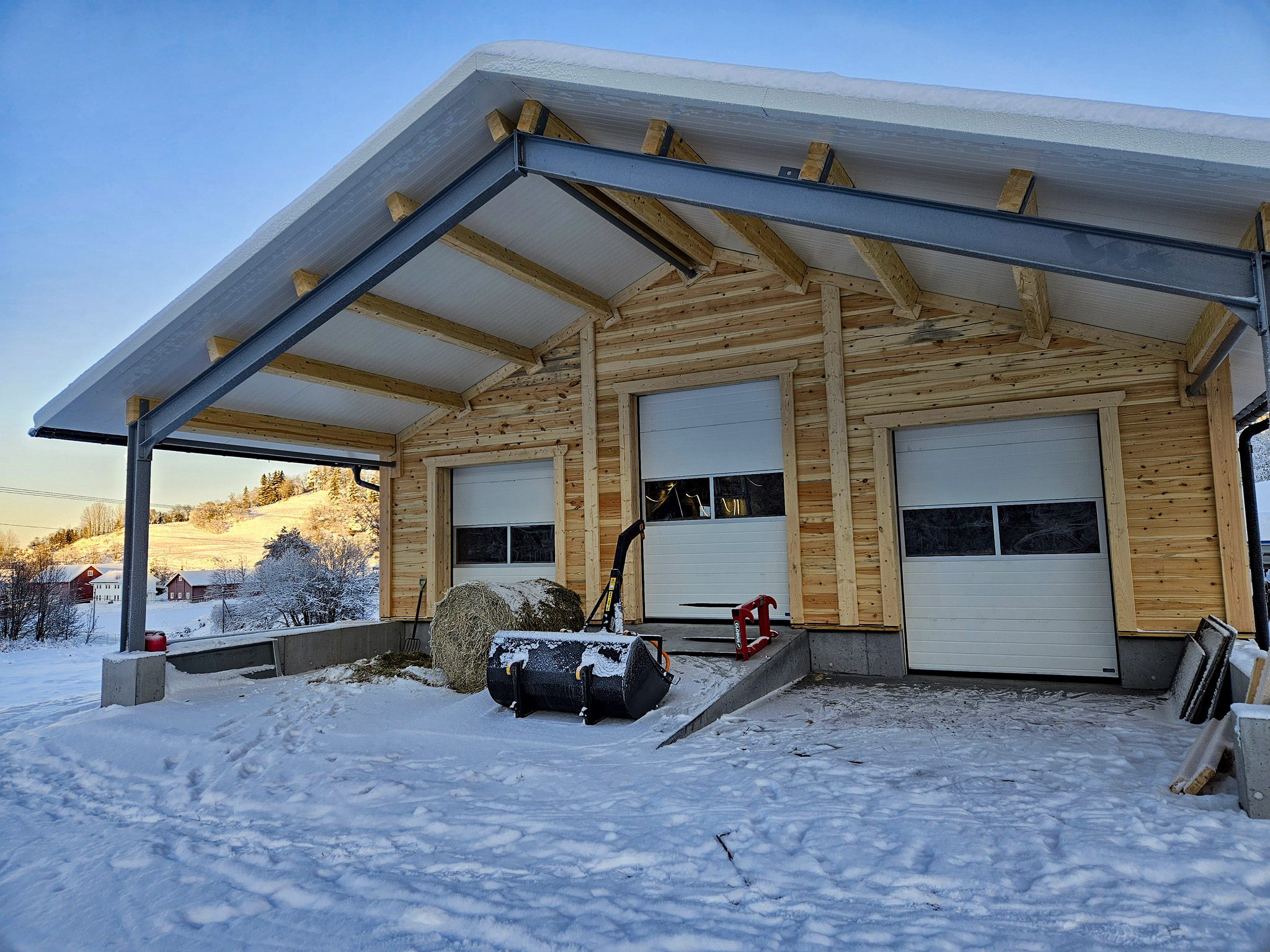 Fjøssystemer Bygg har levert temperert tilbygg på 10×30 m, bærekonstruksjon av stålrammer, isolert sandwich-tak og 140 mm laftevegger. Vi kledde også opp igjen eksisterende lagertilbygg med ny panel.