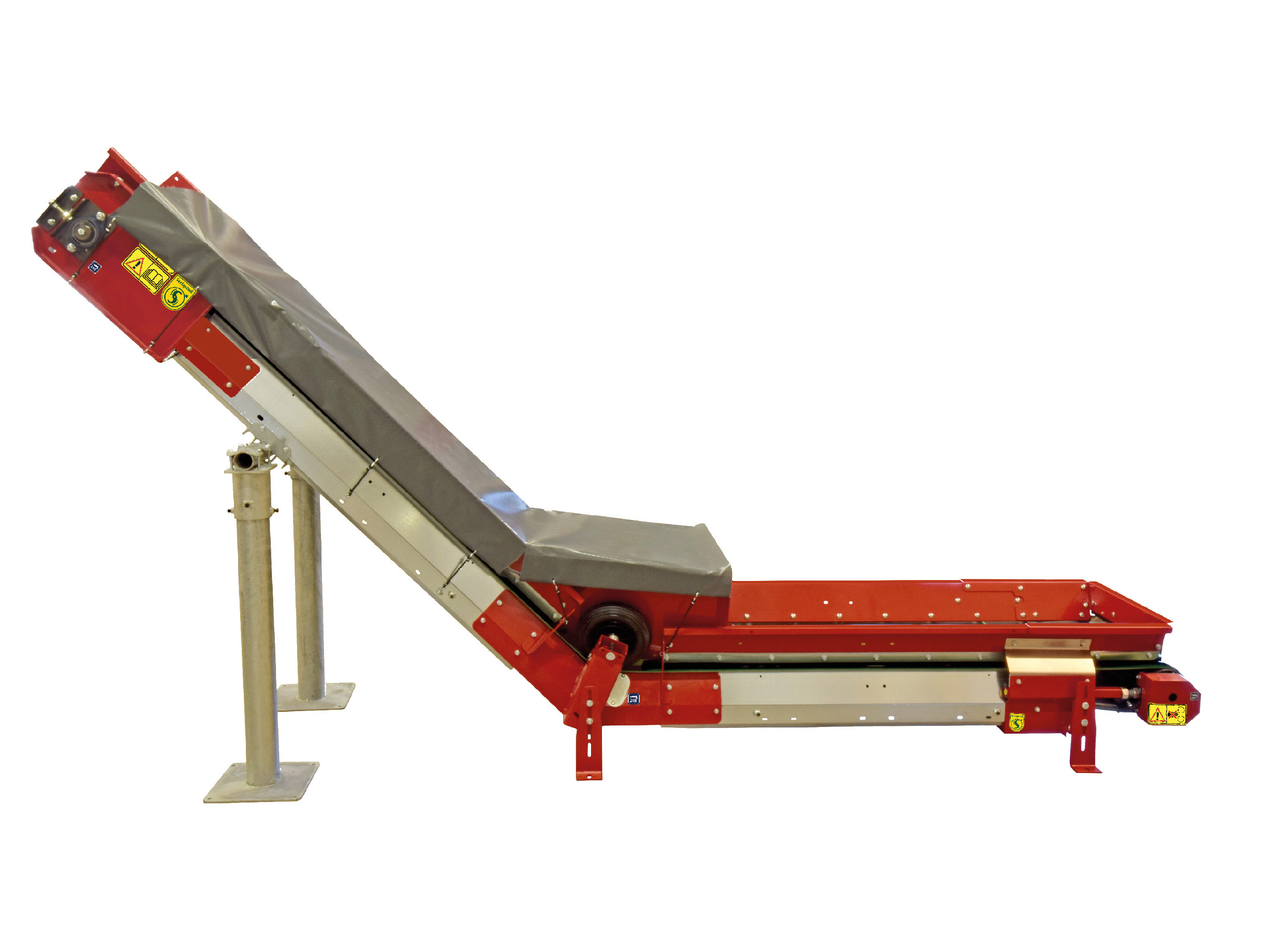 Vinklet gummielevator er en plasseffektiv løsning for transport av fôrmidler. Det unike med denne elevatoren er at den først går horisontalt for så via en vinkel går til stigning på samme band, med samme drivenhet. Elevatoren leveres med fast vinkel på 25, 35 og 45. Den vinklede gummielevatoren er modulbasert og består av en startmodul, midtseksjon og en drivemodul. Midtseksjoner finnes i 1,5 og 3 meter seksjoner.